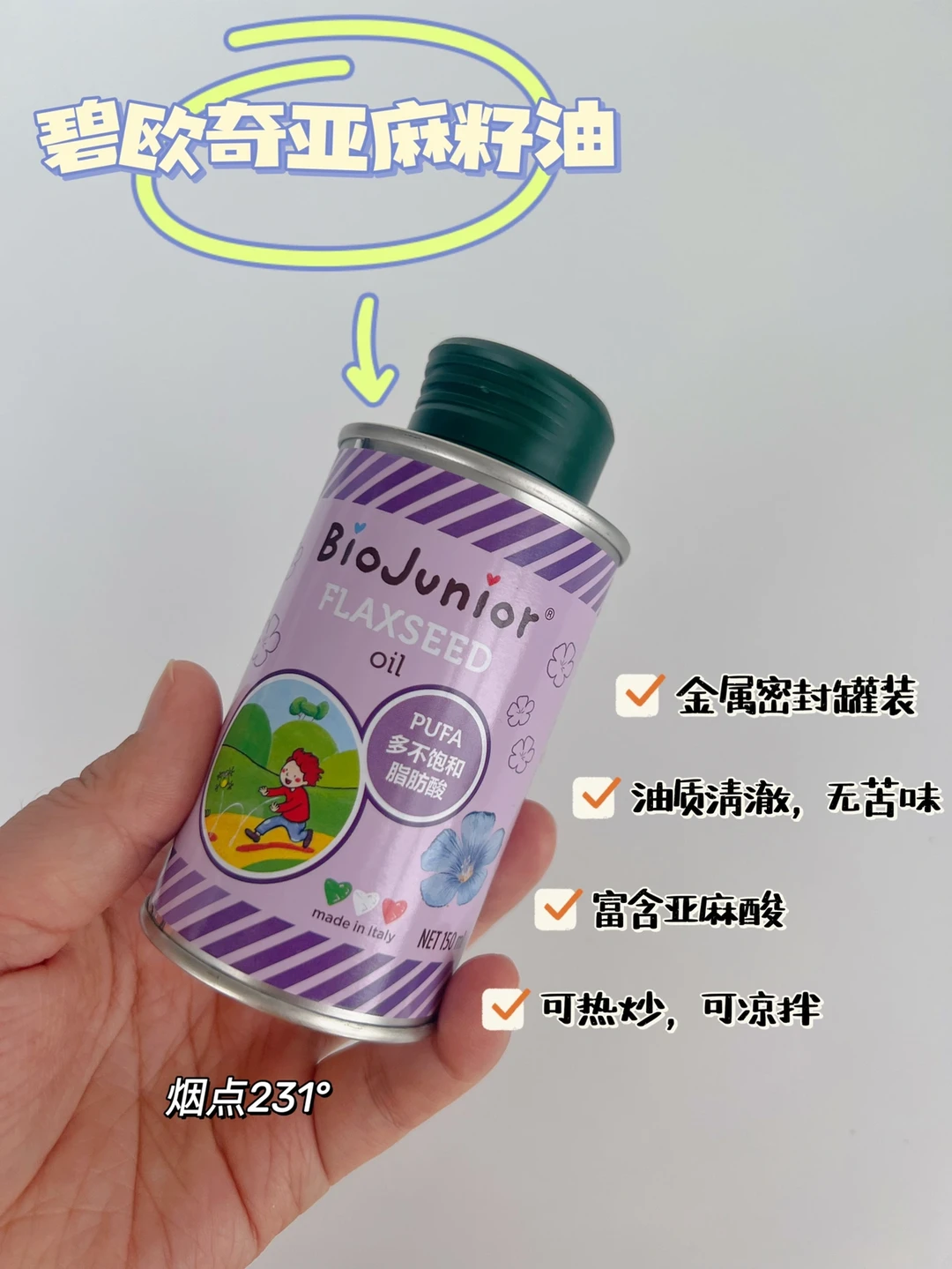 🔸给宝宝添加辅食的时候,可以配上碧欧奇亚麻籽油,烟点231度,适合作为宝宝的热炒油,味道鲜美,营养均衡,它富含的多不饱和脂肪酸可以给宝宝补充必须脂肪酸,亚麻酸含量55%,是牛油果的90倍,而且油质清澈,无口味,宝宝容易接受,宝妈们可以放心选择~