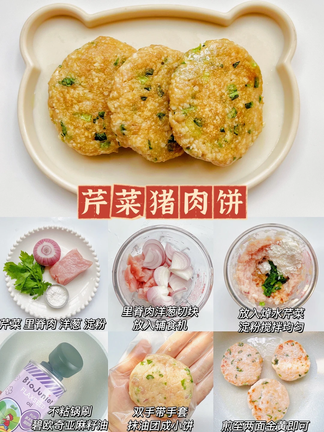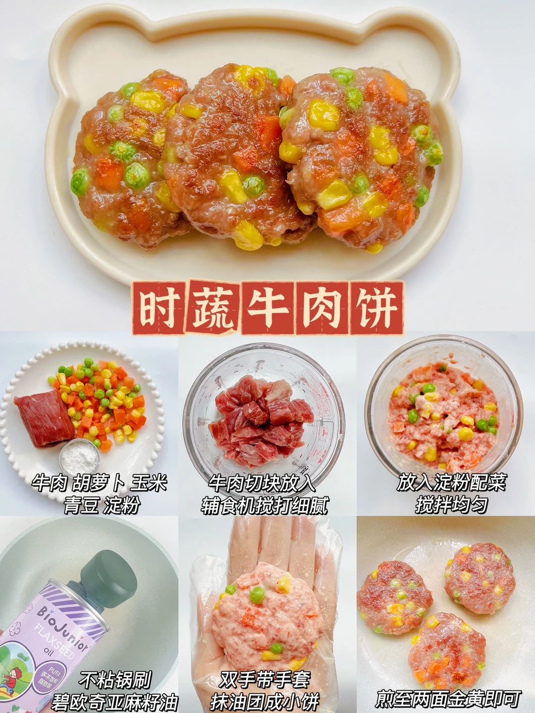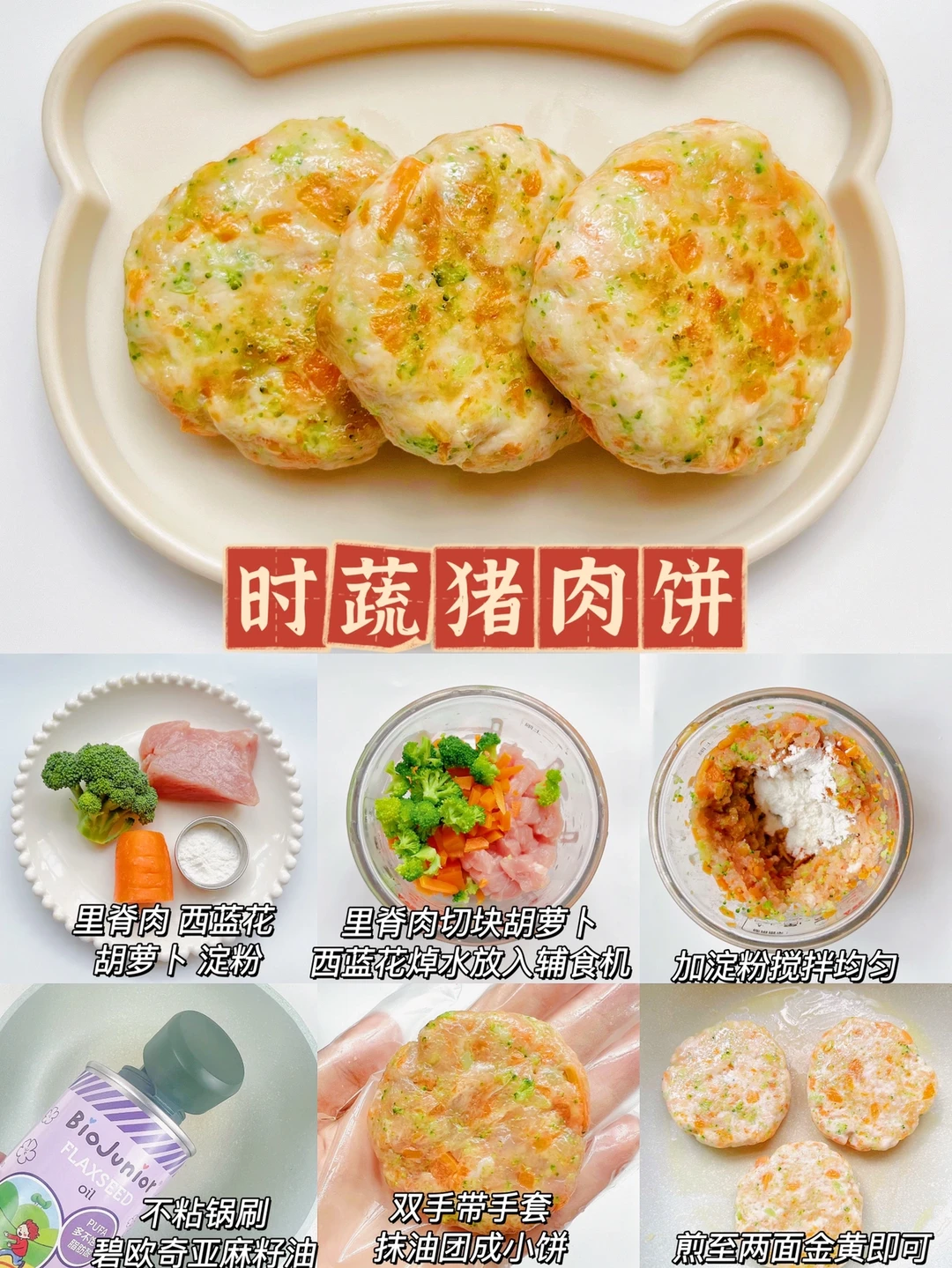 一种肉肉➕2种或者2种以后时蔬(一般都需要焯水更容易消化)➕适量淀粉搅拌均匀,蛋清不过敏的可以加个蛋清更嫩,时蔬没有固定比例,喜欢可以多加,不喜欢少加,最后搅拌至有明显阻力,1岁以上➕调味品,双手带手套抹油团成小饼,放入刷油的不粘锅中,小火慢煎至金黄熟透即可,也可以➕一点点水焖下熟的更透些!