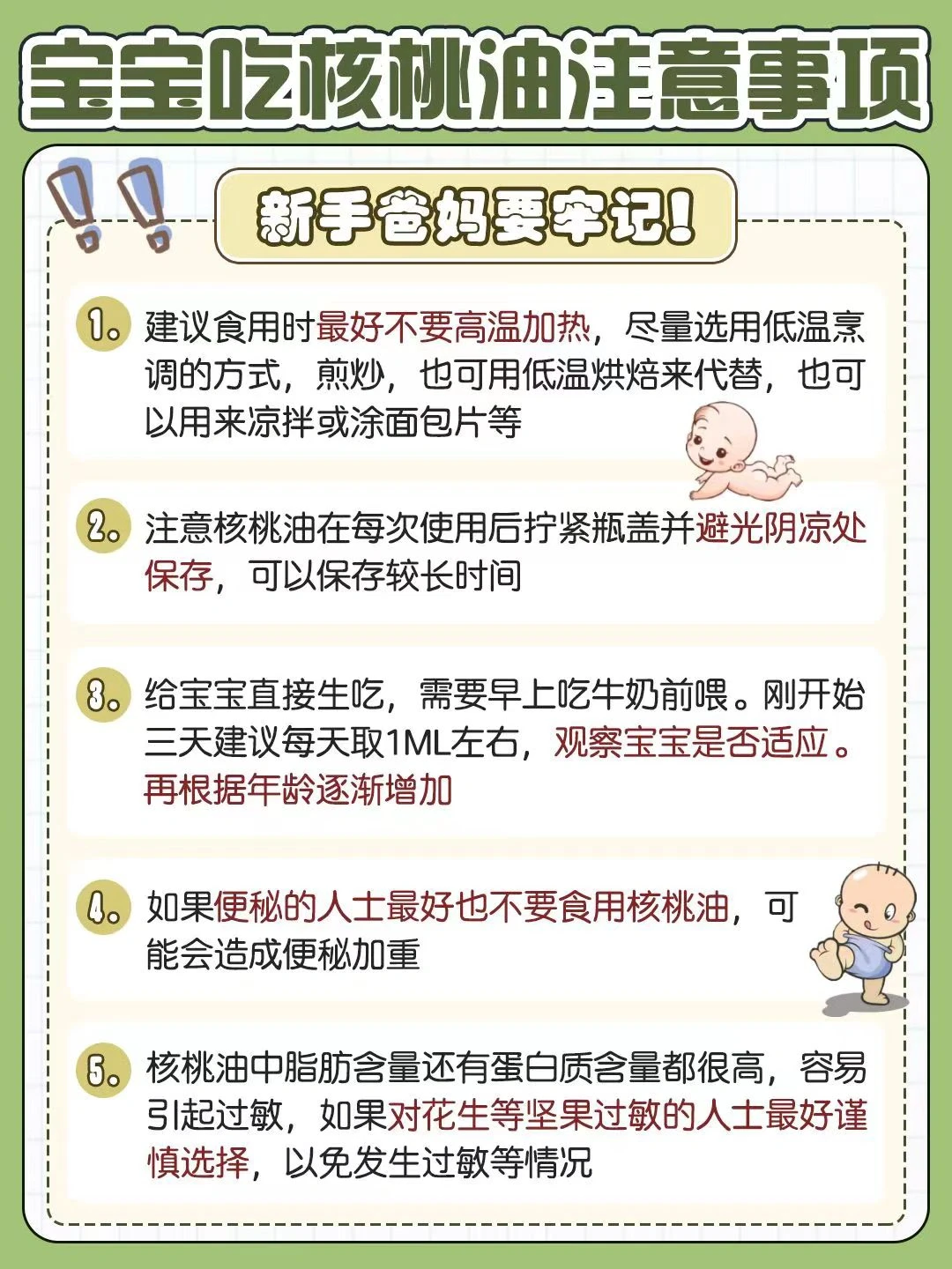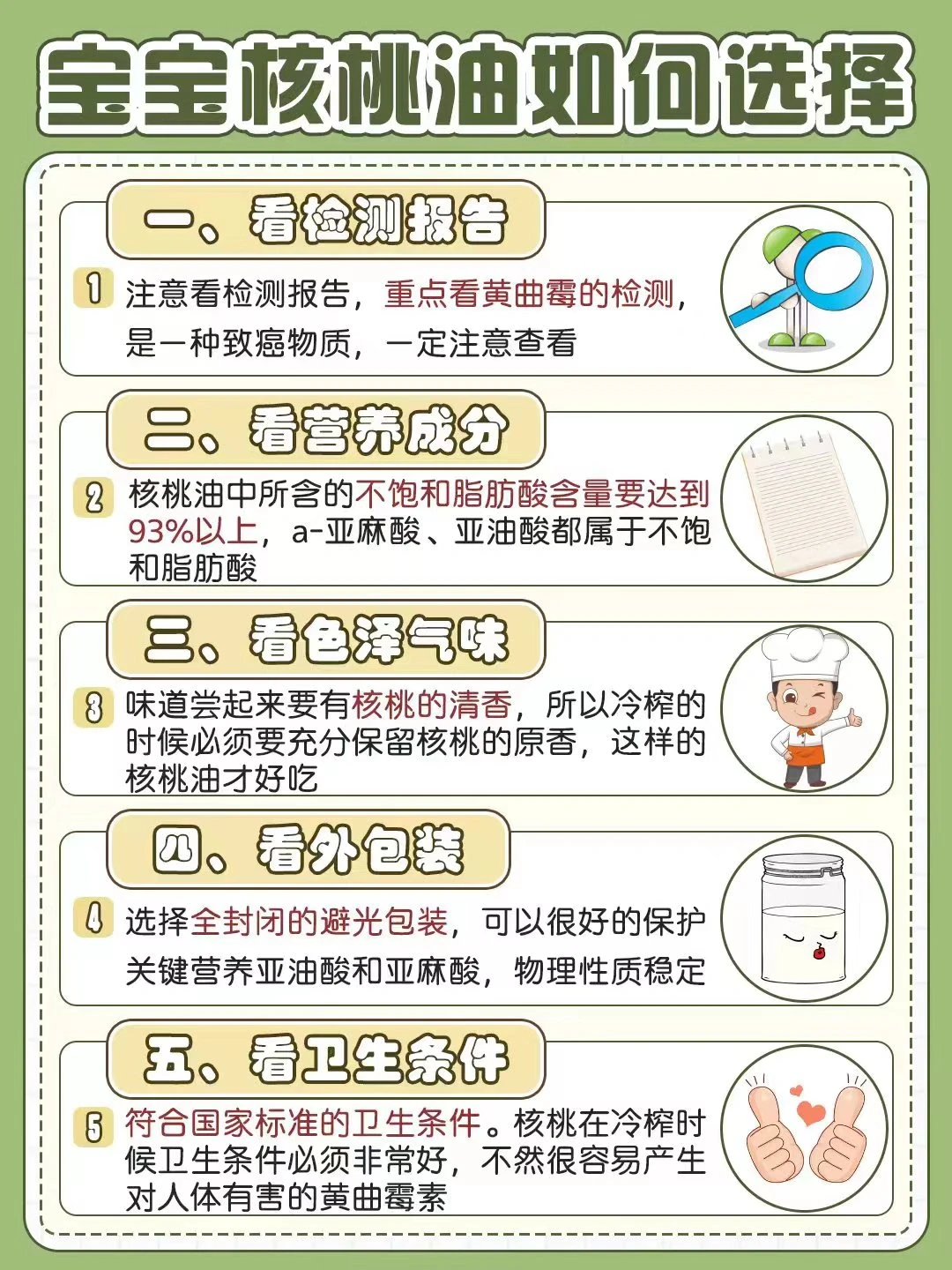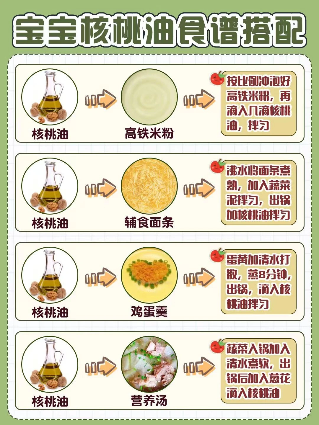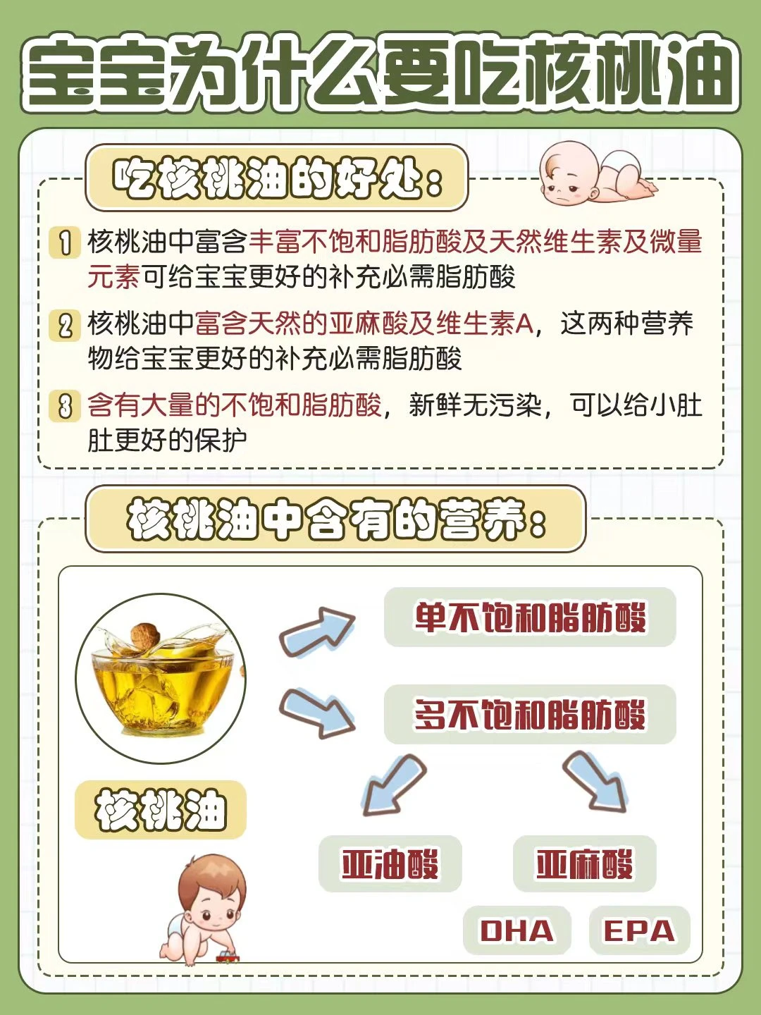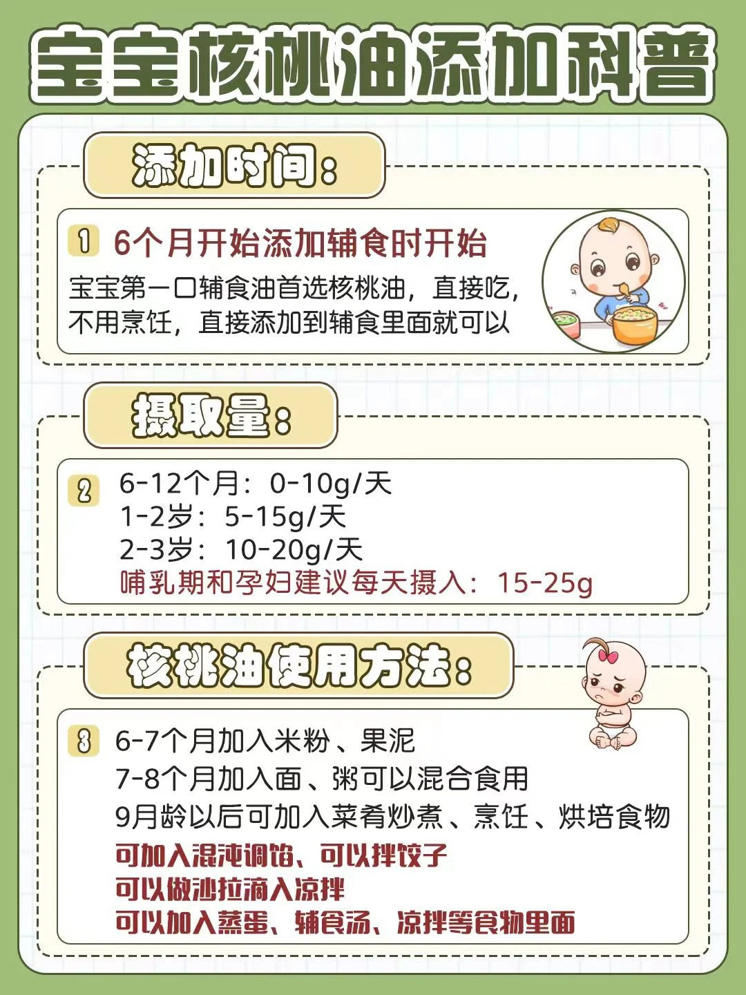 🔸第①口选核桃油,口味清淡,宝宝易接受,添加辅食多样化后,再添加亚麻籽油,凉拌热炒都可以,月龄越大,热炒油用的越快,可以加多一款热炒牛油果油.
