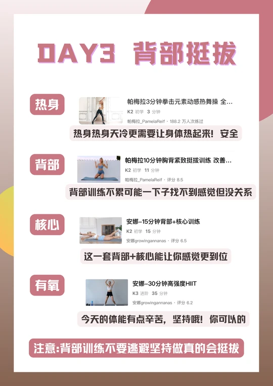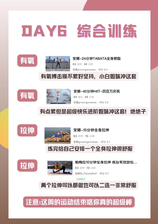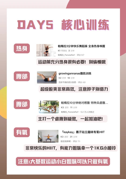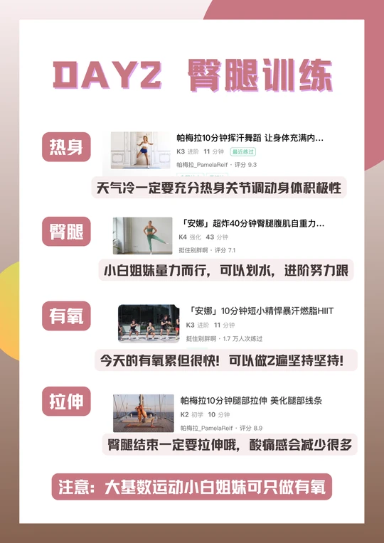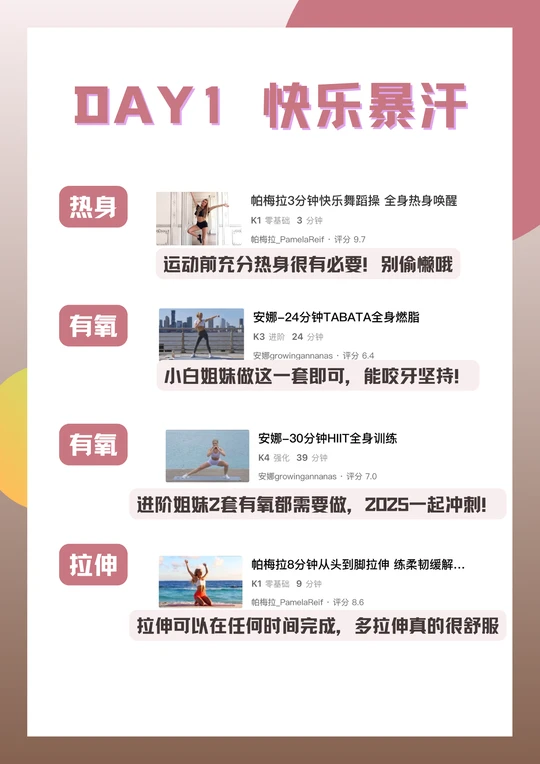 身高:172cm 体重:65kg-53kg 体脂:28%-18% - 2025年的最后一个月即将到来 为了不要给自己留下遗憾 不如一起努力一把 行动是缓解焦虑最好的方法 别摆烂!一起开始吧 - 👀适合姐妹: ✅小白大基数姐妹挑着练 ✅小基数有运动基础的可以全套跟 ✅姨妈期姐妹前三天好好休息 - ‼️注意事项: 1️⃣都那么努力运动了咱们饮食好好做管住嘴 2️⃣冬天食欲好大家都这样别总暴食后就摆烂 3️⃣天冷把自己穿暖和点喝热水很有效 - 一起加油 你值得遇见更好的自己