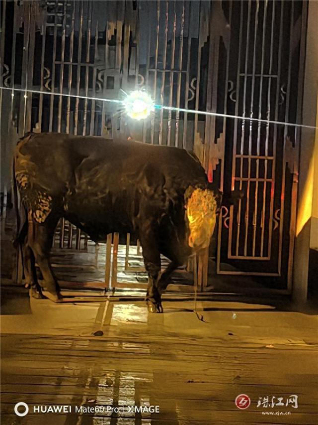 11月18日清晨早高峰时段,一头黄牛突然出现在车流人流量密集的城区主干道上,致使过往车辆纷纷紧急避让,现场险象环生。接到警情后,特巡警队员迅速出动抵达现场。面对这一特殊的“不速之客”,队员们沉着应对、分工协作:一组队员立即疏散围观群众并指挥交通,确保道路基本畅通;另一组队员则小心接近黄牛,尝试引导其至安全区域。当时天寒雨急,一名带班民警虽患感冒却始终坚守一线,衣物被雨水浸湿也毫不在意,全力守护在黄牛身旁,防止其受惊冲撞行人车辆。处置过程中,一名具备养牛经验的队员发挥了关键作用,用专业的方法稳定住黄牛情绪,并成功将其安全控制。与此同时,队员们通过多方排查,终于联系上了正心急如焚寻找黄牛的主人念某。据念某介绍,这头牛是其餐馆准备宰杀的菜牛,此前在运输途中意外跳车,才“误入”了繁忙的城区。