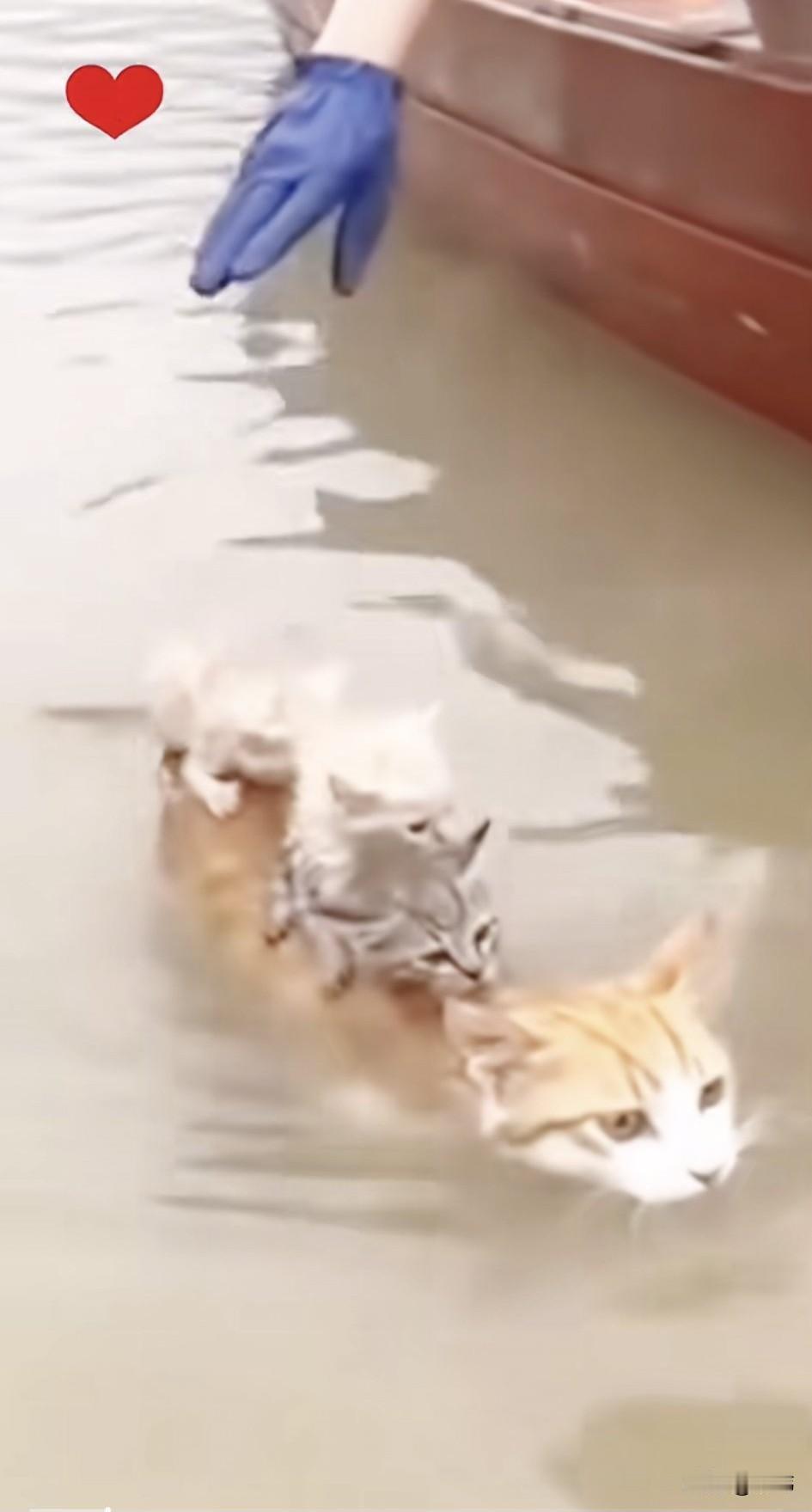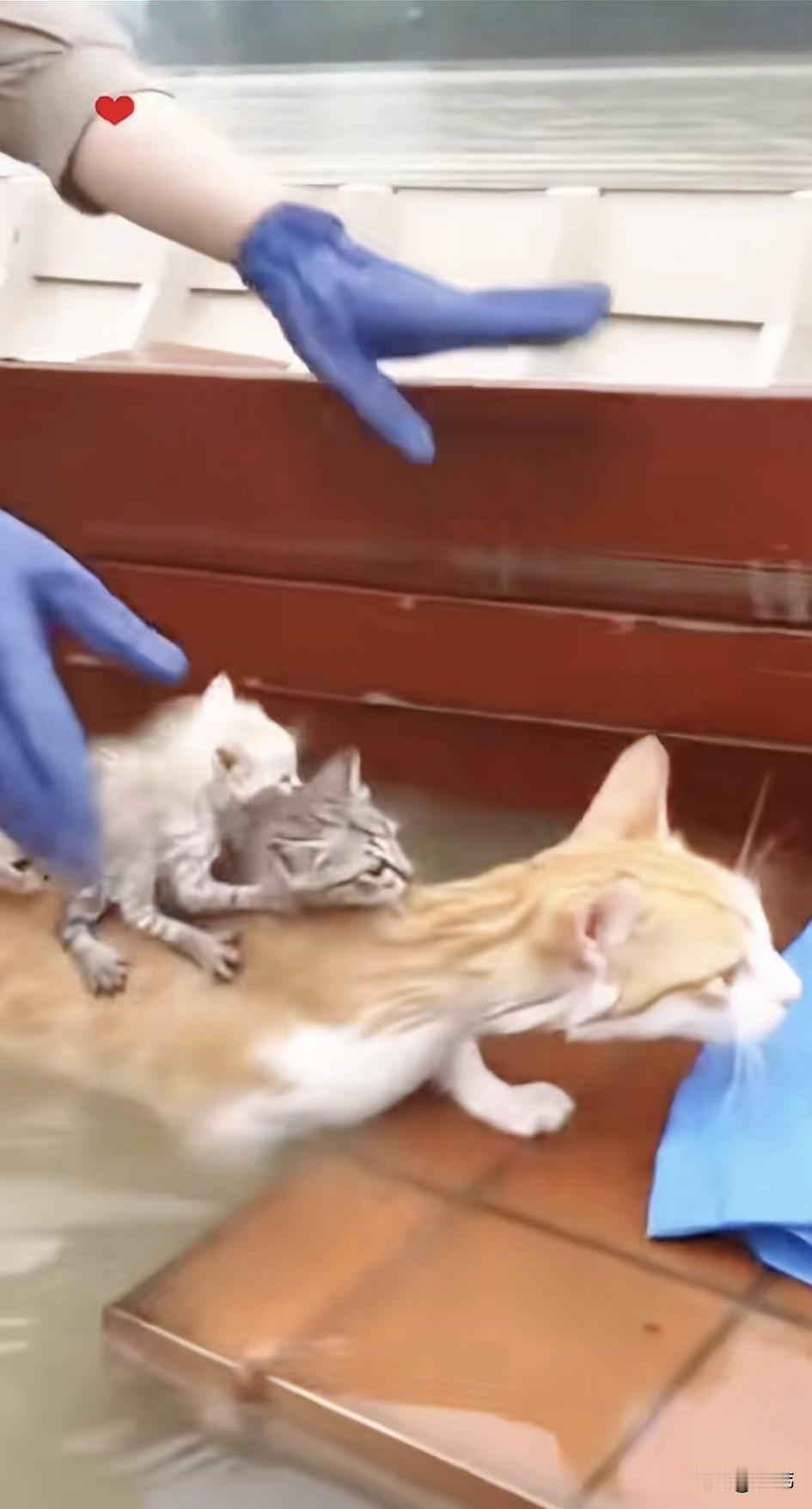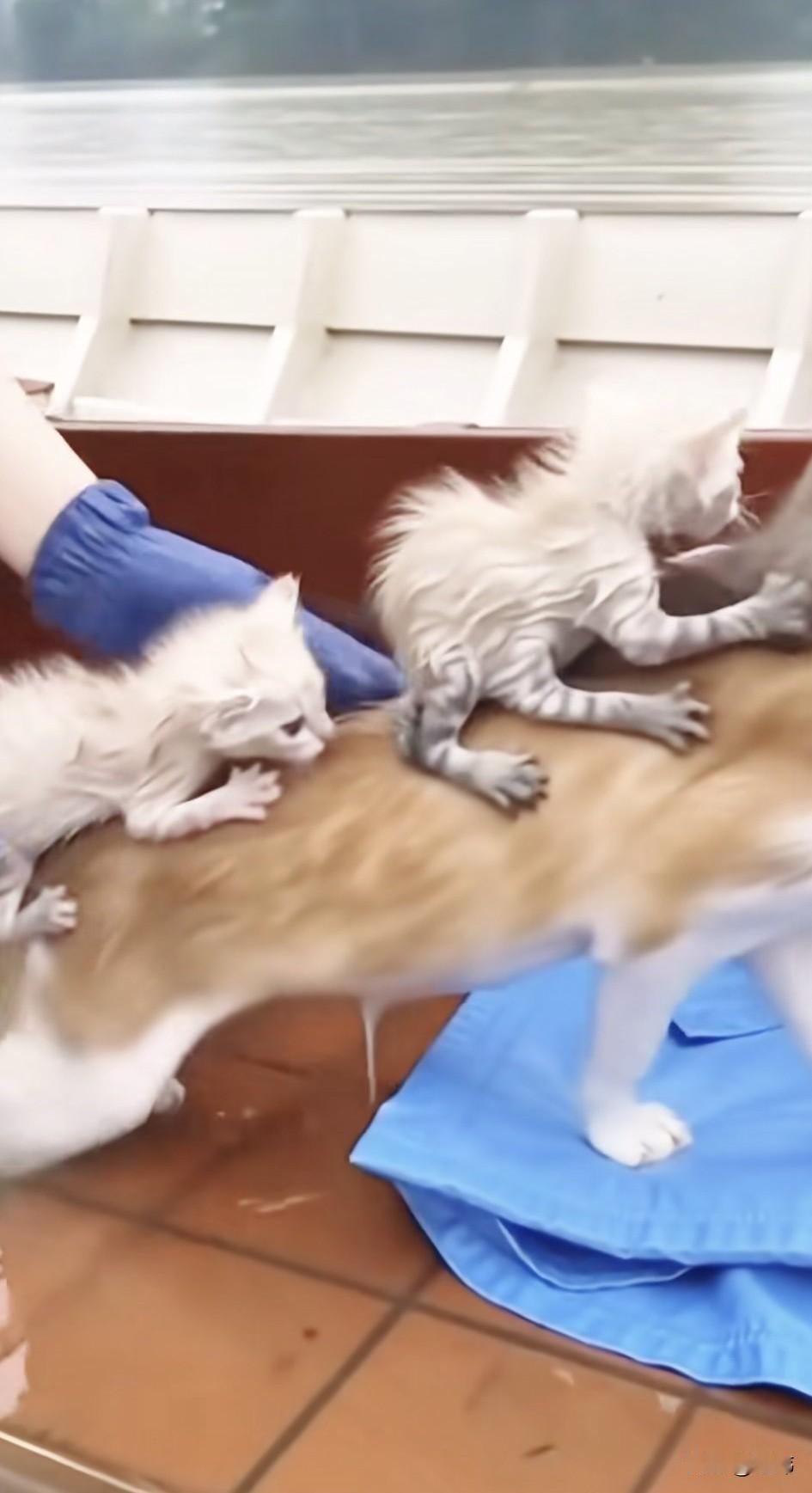 真的是为母则刚!这天一个村子发生了洪灾,一只流浪猫妈妈的家也被洪水淹没了,它拼了命才把两只小奶猫从猫窝里叼出来弄到自己的背上。 它就这样驮着它们在洪水里游着,它原本不会游泳,却在这生死攸关的时刻硬是学会了,它也很快消耗了它大量的体力,眼看它就要被洪水淹没,幸运的是一艘救援艇出现了,它们一家被一位好心的救援队小姐姐救了。之后还收养了它们,相信在她的照顾下,猫咪一家也会过上安稳的日子。