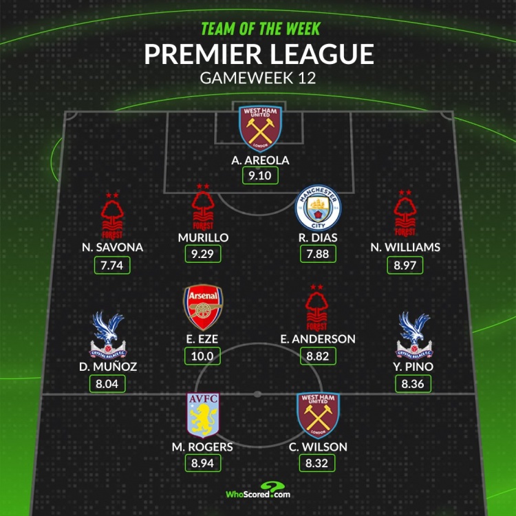 直播吧11月25日讯WhoScored根据球员的评分排出了英超第12轮最佳阵容,埃泽、鲁本·迪亚斯、罗杰斯在列,诺丁汉森林4名球员入选。