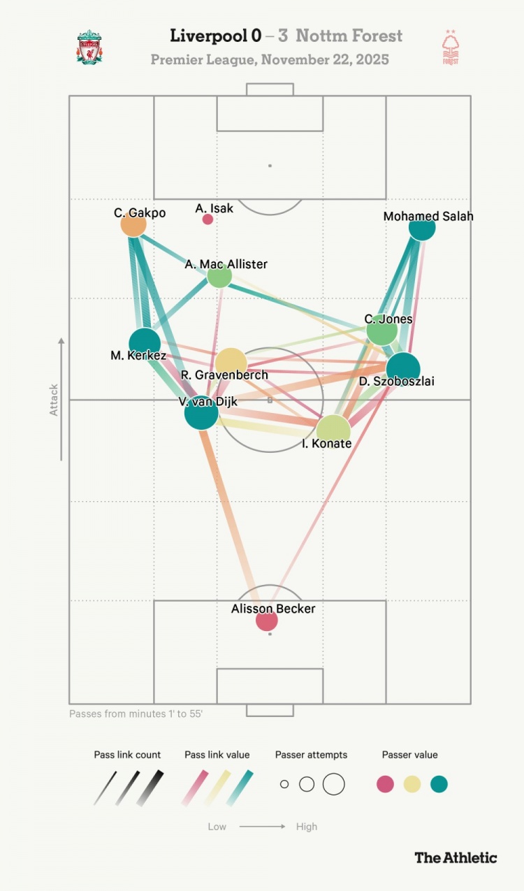 利物浦0比3诺丁汉森林的比赛中,传球分布图可见伊萨克的“孤独”
