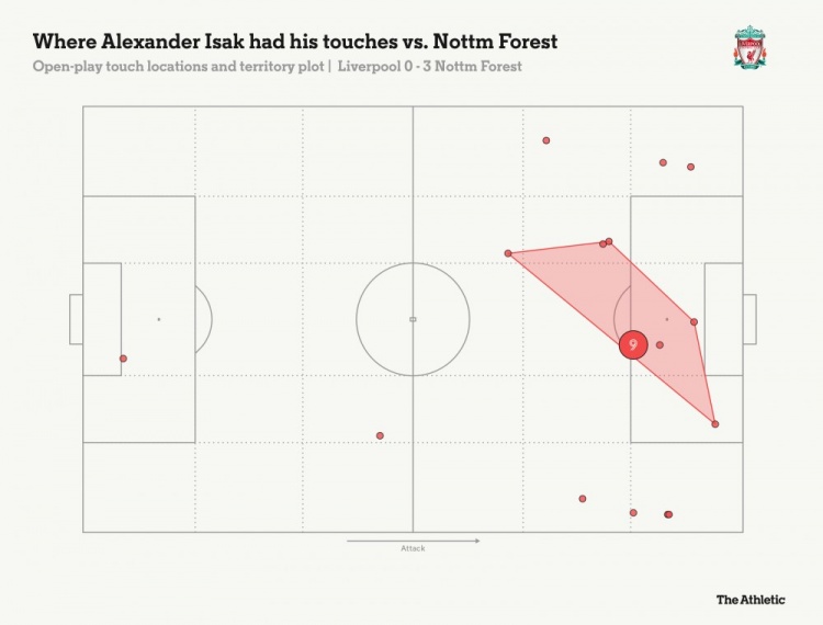 这与科利莫尔的情况不同,利物浦清楚如何发挥伊萨克的特点。理论上他比努涅斯更符合球队需求。比赛中不乏伊萨克正确跑位、队友试图输送的瞬间,但总因传跑失误失之交臂。