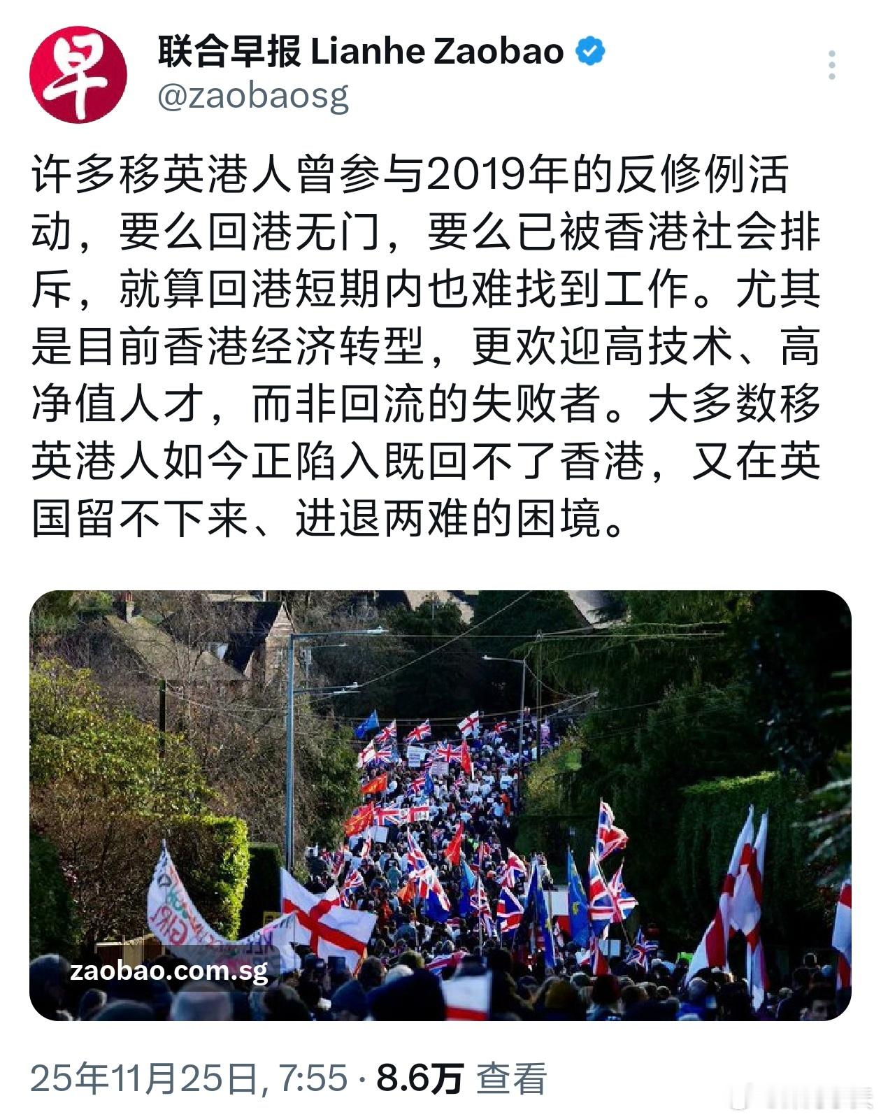 新加坡媒体:移英港人日子不好过,香港又不欢迎回流的失败者。联合早报报道,数以十万计的港人2019年以来移居英国后,不少人皆在融入当地社会遭遇困难,在就业、住房、医疗等方面面临多重压力,生活质量持续下降。部分人由于积蓄即将耗尽,已陆续回流返港。外界普遍相信,这次英国政府提高移英门槛,将会引起新一波港人回流潮。英国首相斯塔默将于明年1月底访华,这将是自2018年特雷莎・梅以来英国首相时隔七年首次访华,被视为中英关系解冻的关键一步,标志着双边关系进入新阶段,也反映英国在香港BNO政策问题上只会收紧,不会放宽。许多移英港人曾参与2019年的反修例活动,要么回港无门,要么已被香港社会排斥,就算回港短期内也难找到工作。尤其是目前香港经济转型,更欢迎高技术、高净值人才,而非回流的失败者。大多数移英港人如今正陷入既回不了香港,又在英国留不下来、进退两难的困境。