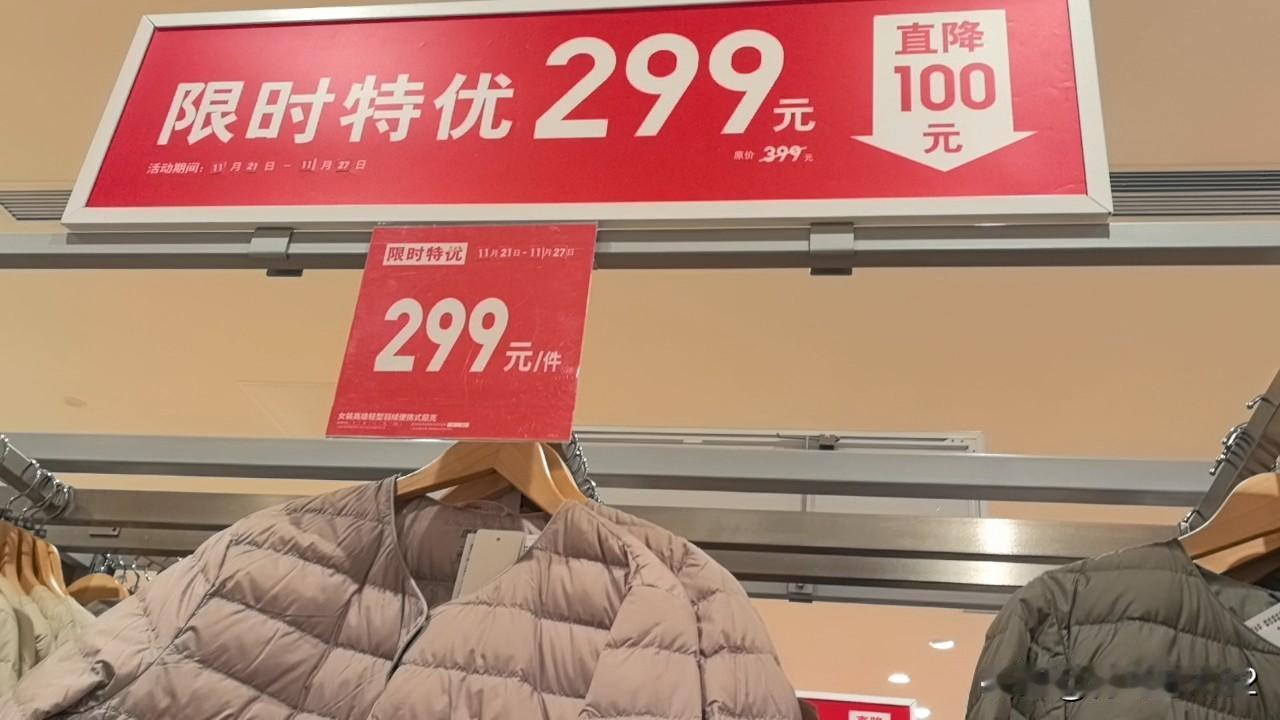 平日我在优衣库看好的衣服,只要不降价,我会暂时忍住不买,但等它降价的时候,我再买,这样能省下不少钱。 比如:图一至图3这件羽绒棉服原价399元,现价299元,直降100元。 这件衣服我在前年就买了,也是在降价百元后,化299元买的。我买的是浅粉肉色的。穿起来轻薄暖。 天不太冷的时候,当外套穿,天太冷的时候。当内搭穿。外面可以再套一件厚外套,保暖性绝对增强很多。 这件衣服限时特优至11月29日,有兴趣的朋友,不妨过来考察一下。