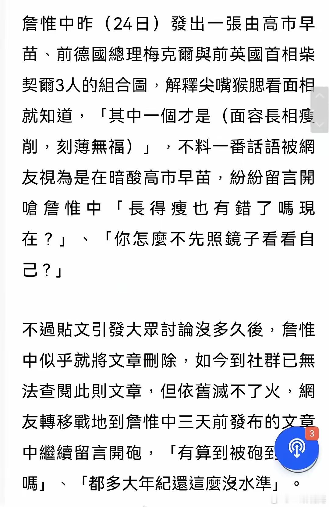台湾省命理师詹惟中,因为在网上暗示高市早苗“尖嘴猴腮,刻薄无福”,而遭到大批台湾皇民围攻,虽然此后他删除了帖子,但皇民依然不依不饶,跑到他其他帖子下谩骂。