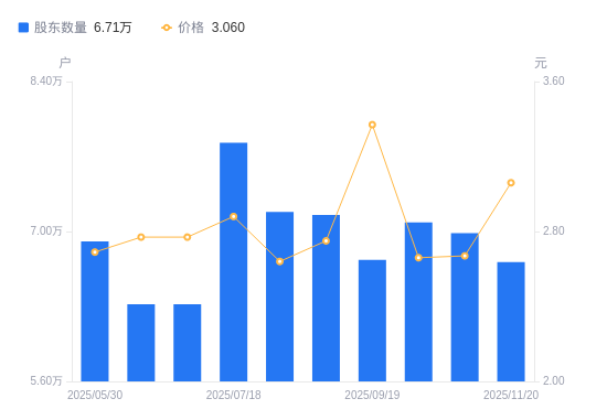 近一年(2024年11月20日至2025年11月20日),金浦钛业A股股东户数从6.85万户,减低至6.71万户,降幅1.97%,区间股价上涨21.43%。