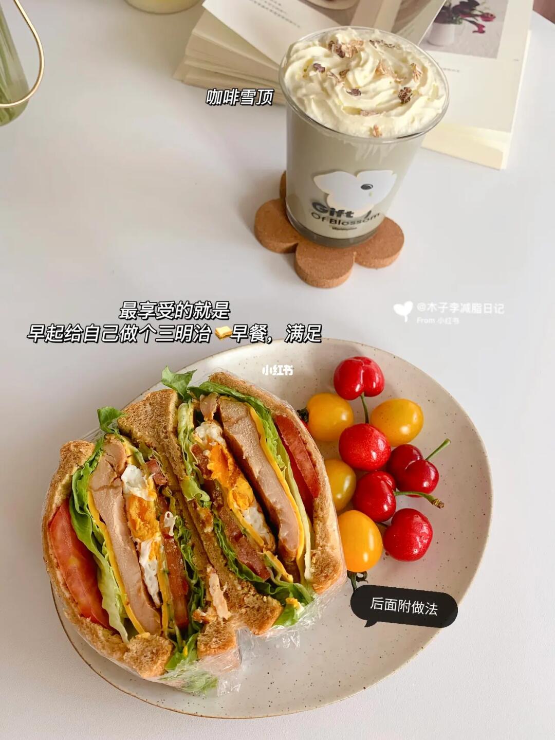 🍳早餐:蔬菜鸡胸肉三明治|樱桃|奶咖雪顶|千禧果