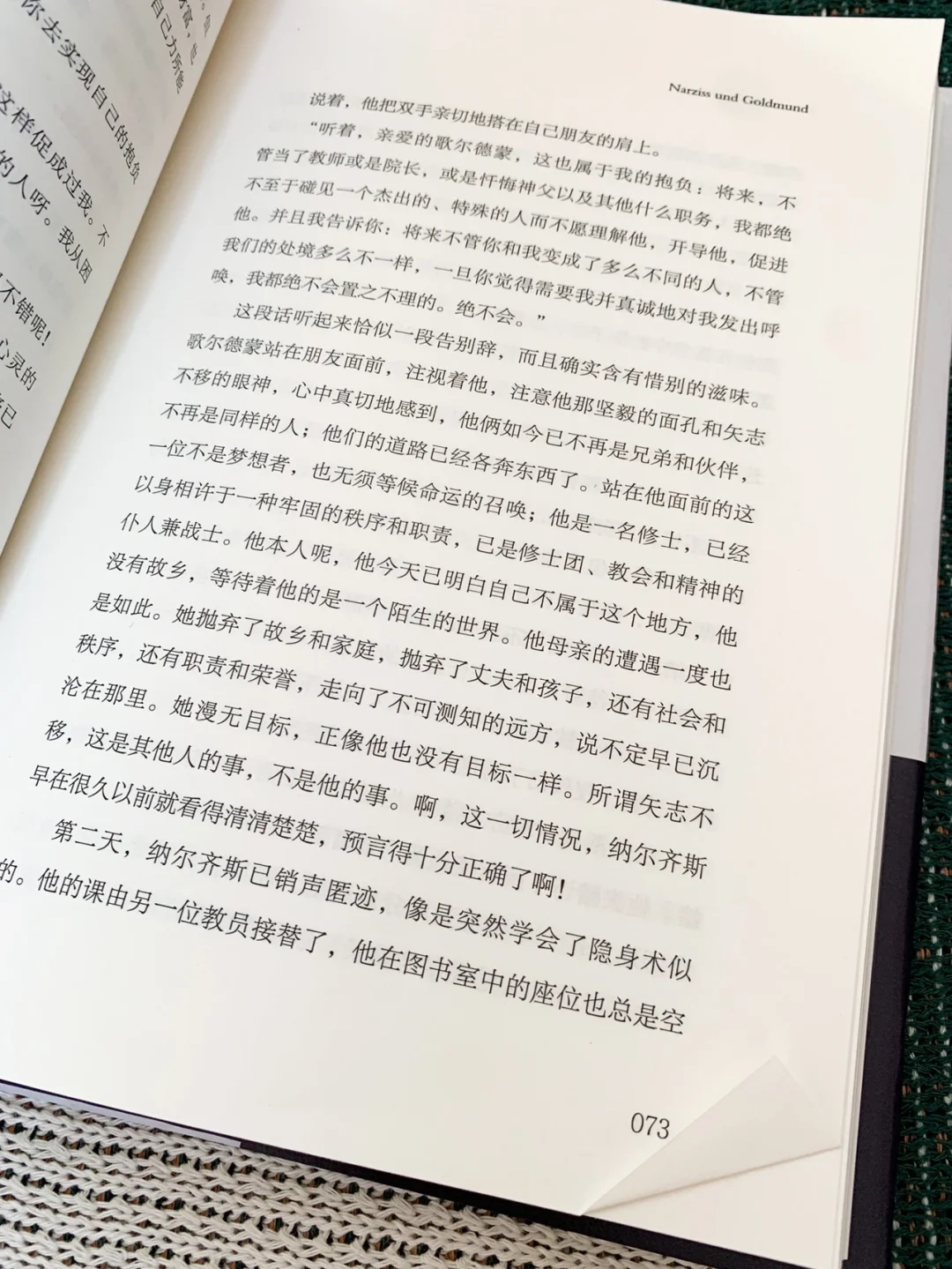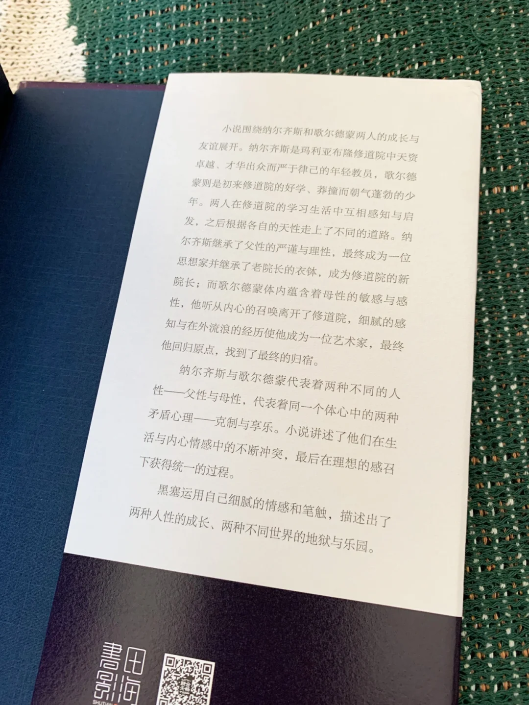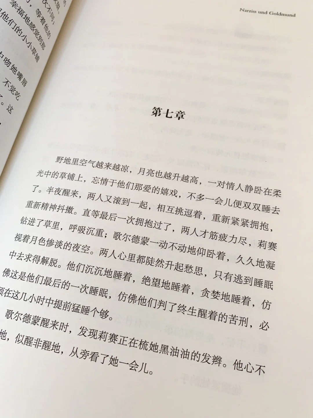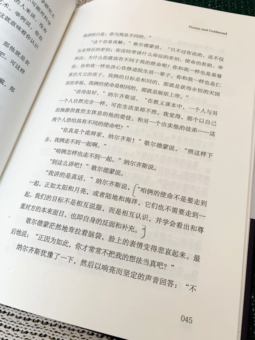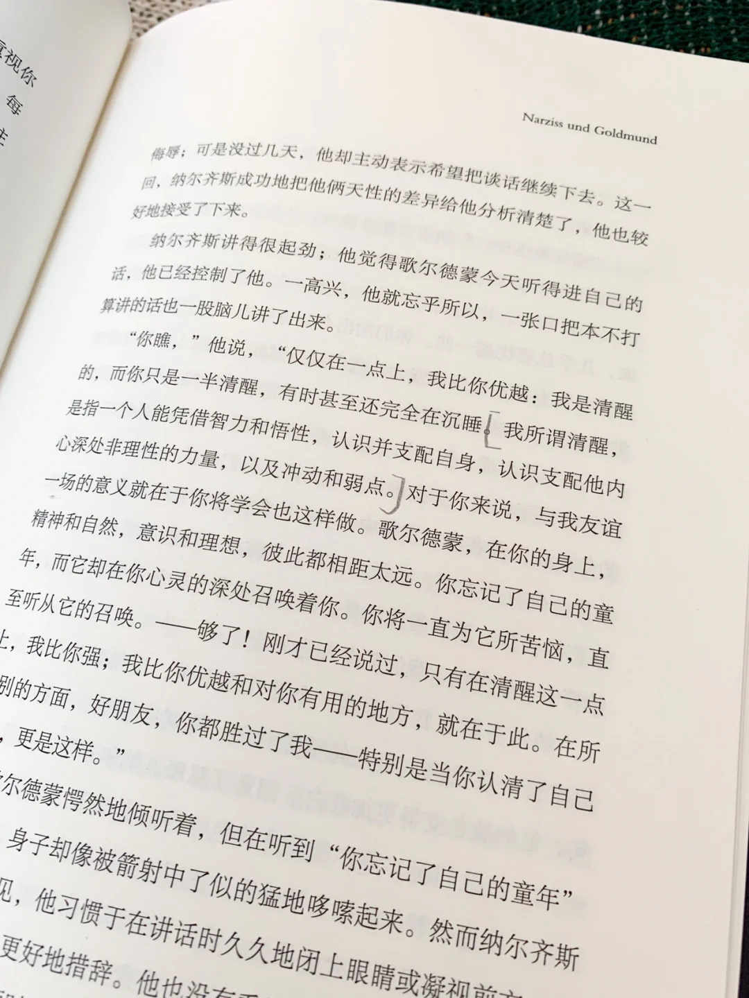 💡我喜欢书中黑塞一贯延续地思辨讨论这一部分,当“理性”的歌尔蒙德埋怨“感性”的纳尔齐斯将他当作孩子看待时,纳尔齐斯告诉他,因为他没有保持纯粹的本色,而是表现着他人希望看到的样子“我没有任何别的希望,只希望你成为纯粹的、彻底的歌尔德蒙。你不是一个学者,你不是一个修士-当学者或者修士在你都是大材小用。你以为我嫌你不够博学,头脑里缺乏逻辑,或者不够诚笃吗?噢,你错啦,我是嫌你保持你自己的本色不够。”