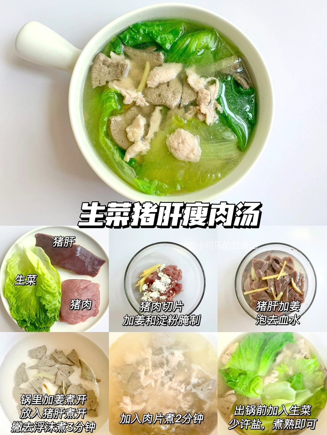 1⃣️猪肉加姜和淀粉抓拌均匀腌制,猪肝加姜泡去血水,锅里加姜片煮开放入猪肝煮沸,撇去浮沫,煮3分钟,加入肉片煮2分钟,出锅前加入生菜,加少许盐调味即可