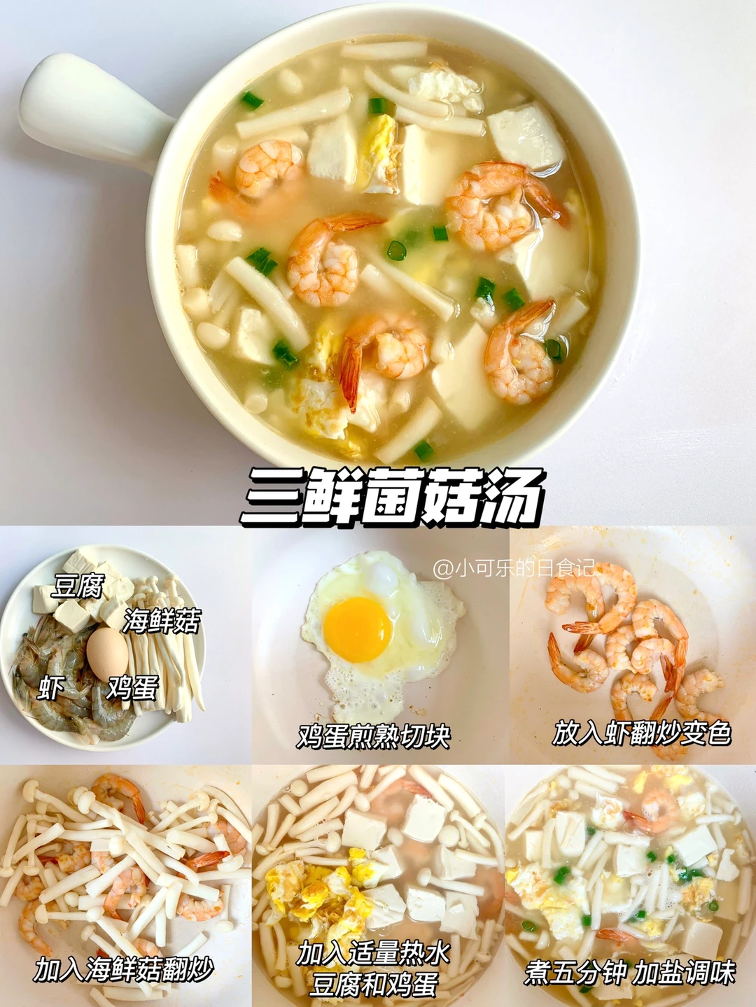 1⃣️锅里刷油,鸡蛋煎熟切块,倒入虾仁炒变色,倒入海鲜菇翻炒均匀,加入热水,豆腐和鸡蛋煮5分钟,加少许盐调味即可