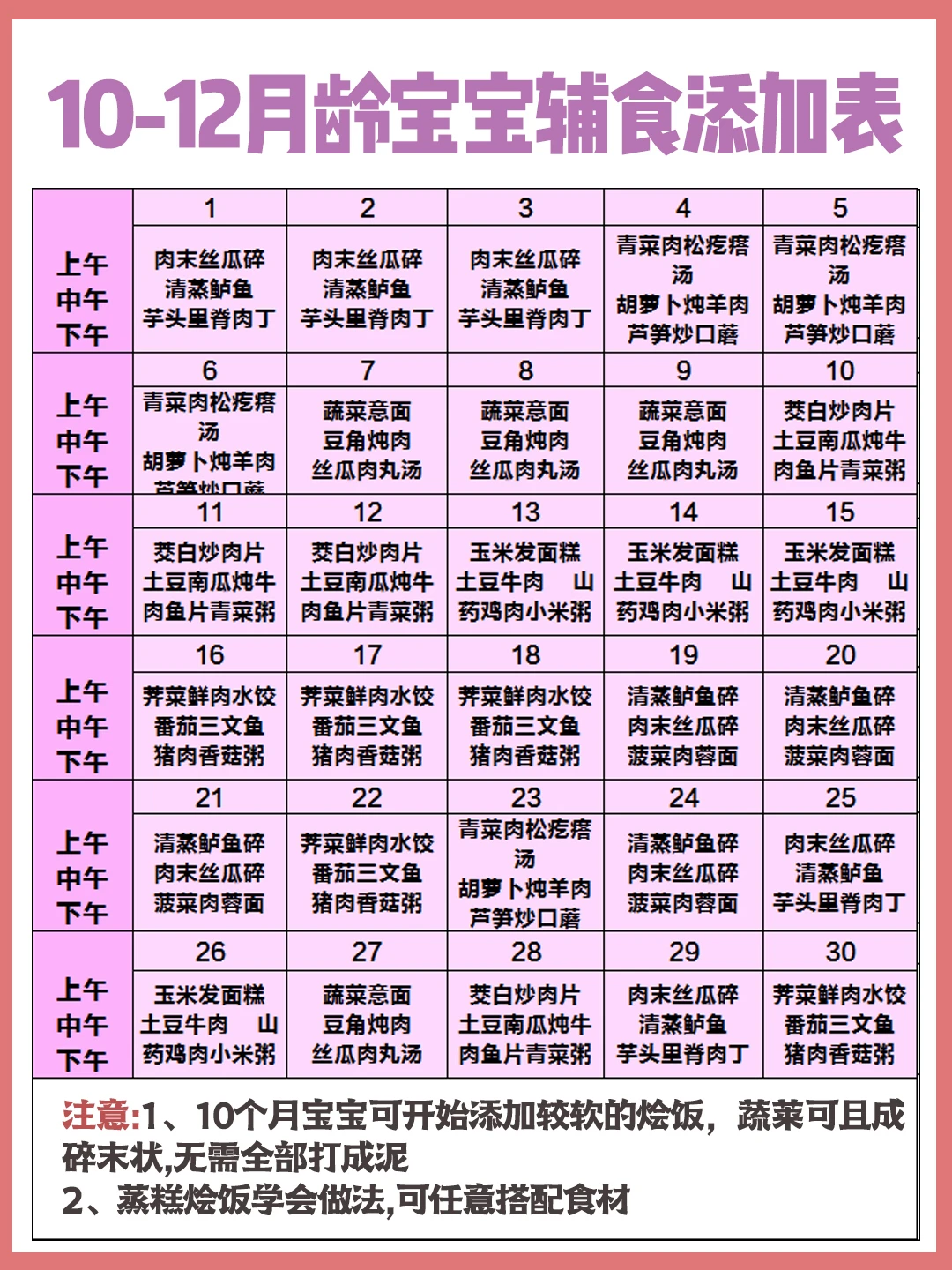 每日添加2-3次辅食,泥糊状食物过渡到半固体食物(软烂面片、蔬菜碎、肉末碎丁等)