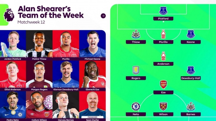 直播吧11月26日讯英超第12轮战罢,阿兰·希勒评本轮最佳阵容,皮克福德、埃泽、摩根·罗杰斯在列。