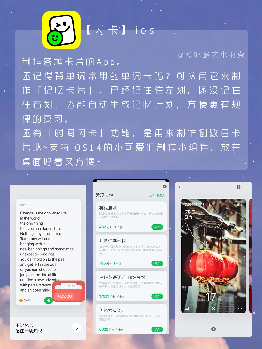 大家好,我是蓝卟噜的小书桌[吧唧R][吧唧R][吧唧R] 喝水提醒、日常管理、阅读知识…这些App放在手机里,手机瞬间变实用啦‼️ 是精致女孩子一定要拥有的呢[赞R][赞R][赞R] 🍬Color Widgets 🍬简讯 🍬试盒 🍬Plant Nanny² 🍬记事探险 🍬闪卡 🍬私家书藏 你们用过哪个呢[偷笑R][偷笑R][偷笑R]