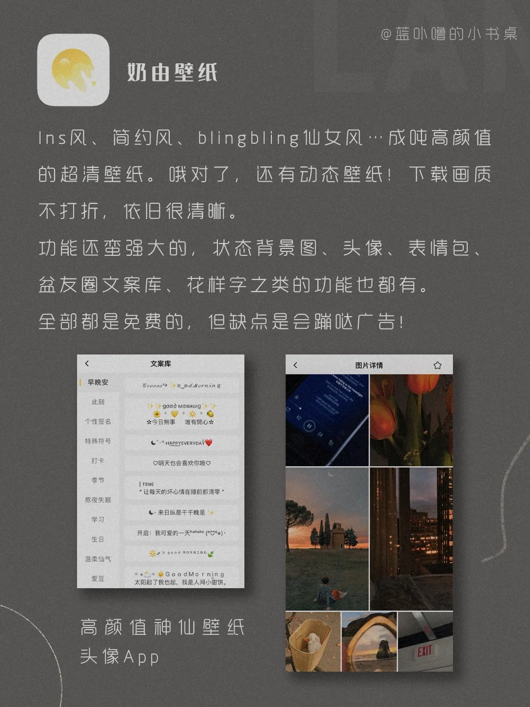 大家好呀,我是蓝卟噜的小书桌🥰 这次のApp,有文艺范十足の,也有艺术感满满の🙌🏻 全都是我珍藏的小众宝藏App🤍🤍🤍 有了它们的手机,有点不一般哦✨✨✨ 🤍奶由壁纸 🤍罐头艺术 🤍青藤之恋 🤍一日记 🤍晒厨易 🤍几枝 🤍墨鱼书摘 ✨在不愉快的日子里 搜刮生活藏起来的温柔✨