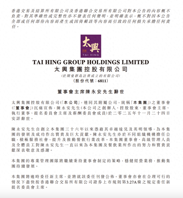 昨天(11月24日)22时许,知名连锁餐饮企业太兴集团在港交所发布公告称,太兴集团控股有限公司创办人、控股股东兼董事会主席陈永安于11月24日当天辞世。