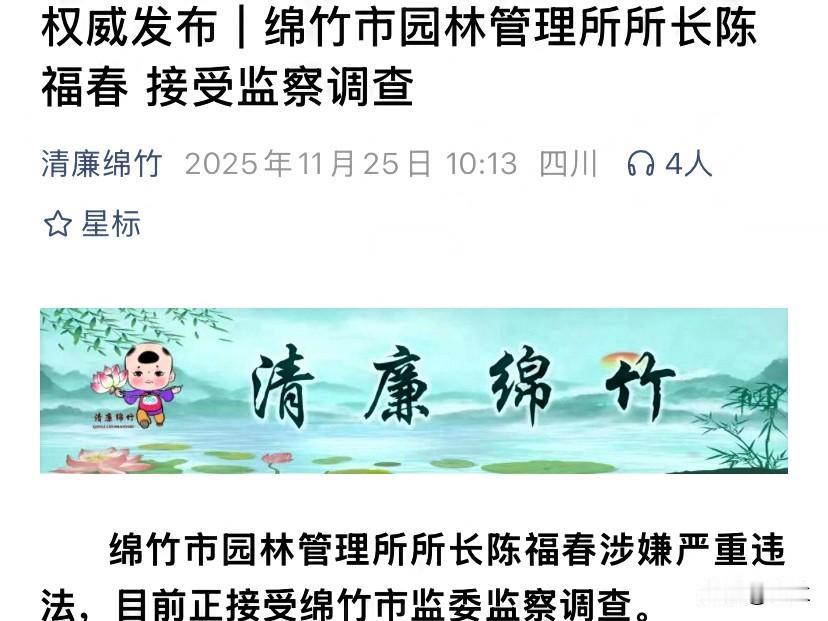今天四川省绵竹市的陈福春栽了, 他是四川绵竹本地人, 一直从事园林工作, 从1997年起就在绵竹工作, 在基层岗位上一待就是20多年, 直到2022年升任为所长, 他不仅熟悉本地绿化事务, 还多次在节日慰问和城市美化活动中侃侃而谈,给不人留下了实干形象, 陈福春今年仅47岁, 正处在事业上升期, 就在前2个月他还在国庆布置中介绍工作, 今天却意外上了热搜, 这正应了那句话: 做了不该做的事, 是不会被放过的!