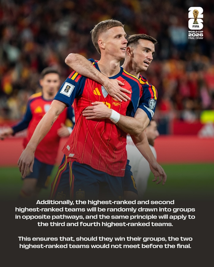 国际足联表示:“为确保赛事竞争性平衡,赛程设计中设置了两条独立的半决赛晋级路径。国际足联世界排名前四的球队需遵守以下约束:排名第一的西班牙与排名第二的阿根廷将被随机分入不同半区,排名第三的法国与排名第四的英格兰同理。这一规则确保若上述球队均获得小组第一,排名前两位的球队将在决赛前不会相遇。”