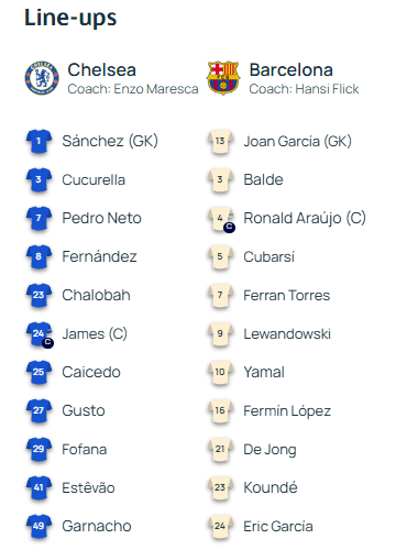 切尔西首发:1-罗伯特-桑切斯、27-古斯托、29-韦斯利-福法纳、23-查洛巴、3-库库雷利亚、24-里斯-詹姆斯、25-凯塞多、8-恩佐-费尔南德斯、7-佩德罗-内托、41-埃斯特旺、49-加纳乔