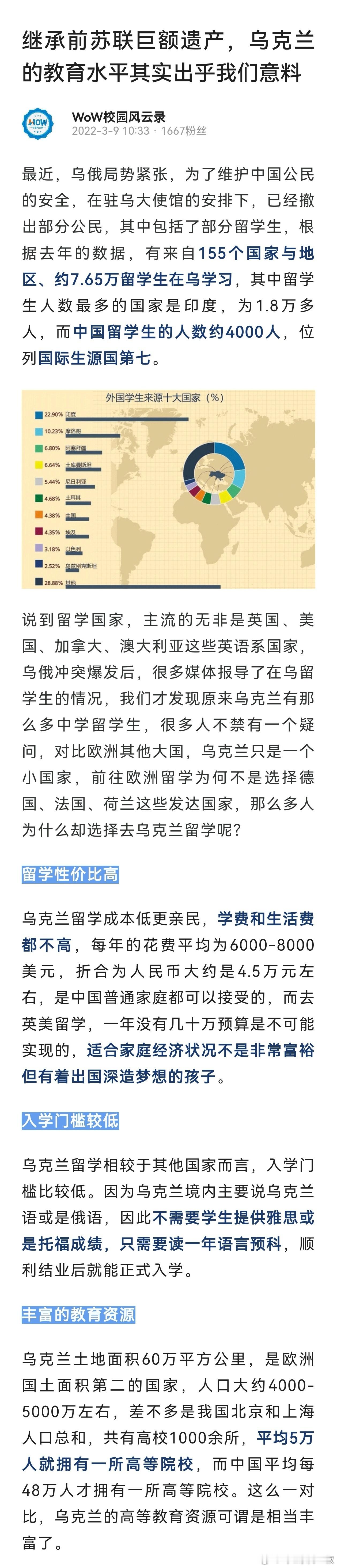 两个事实:图1,战前的乌克兰,是欧洲最穷的国家。汽车购买力是河北衡水的1/10之一。图2:战前的乌克兰,是世界上教育最发达国家。5万人就有一所大学,大学普及率是世界上最高的国家之一。看完这两点,最简单的认知就是:单纯(注:单纯)大学普及,教育发达,是不带来经济发展的。说的都是22年俄乌冲突之前。