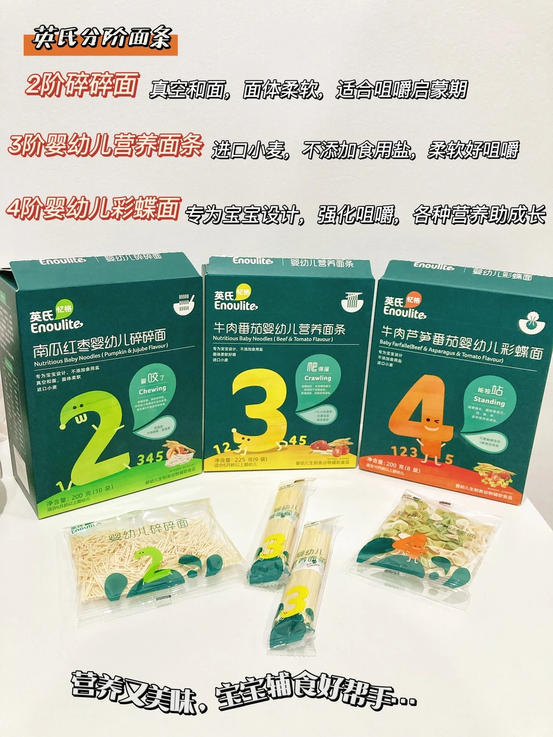 ✅拿宝宝面条来说,英氏的分阶面条不仅参考了宝宝的月龄,更结合了宝宝发育的生理体征来进行划分,宝宝7-9个月左右,开始慢慢长牙了,并且开始喜欢咬手手或者咬东西的时候,就可以开始添加2阶面条了,这种粒粒面和碎碎面很适合启蒙小宝宝的咀嚼能力,没有加盐给宝宝吃来更放心。