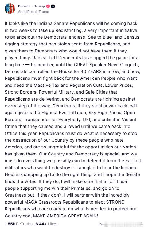 【黄金时代】川普透露,印第安纳州参议院的共和党人似乎将在两周后重返议会,讨论选区重划问题川普:印第安纳州参议院的共和党人似乎将在两周后重返议会,讨论选区重划问题。这项至关重要的举措旨在平衡民主党无休止的“起诉民主党”和操纵人口普查的策略。这些策略窃取了共和党的席位,并将它们拱手让给了那些如果公平竞争根本不可能获得席位的民主党人。激进的左翼民主党人长期以来一直在操纵选举——别忘了,在伟大的众议院议长纽特·金里奇之前,民主党曾连续40年掌控众议院。如今,共和党人必须奋起反击,捍卫美国人民的利益。美国人民渴望并需要共和党正在努力实现的政策,包括大幅减税和放松监管、降低物价、加强边境管控、增强军队实力以及建设安全的城市。而民主党人却处处阻挠。如果民主党人再次夺回权力,他们将再次给我们带来史上最高的通货膨胀、高企的物价、开放的边境、跨性别者权益、多元化、公平和包容(DEI)以及无节制的暴力犯罪——而这些正是他们一手造成的,直到今年我们重新执政才有所改变。共和党人必须采取一切必要措施,阻止那些仇恨美国、对我们国家给予他们的机会毫无感恩之心的人破坏我们的国家。我们的国家和民主制度弥足珍贵,我们必须竭尽所能,捍卫它,使其免受企图摧毁它的极左渗透者的侵害。我很高兴听到印第安纳州众议院正在采取行动,做出正确的决定,我希望参议院也能获得足够的票数。如果他们成功了,我将确保所有支持我的人都能赢得初选,并走向辉煌;如果他们失败了,我将与实力强大的“让美国再次伟大”(MAGA)基层共和党人携手合作,选举出强大的共和党人,他们随时准备采取一切必要措施来保护我们的国家,让美国再次伟大!