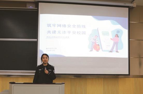 接着,嘉兴市公安局经开分局沈警官为同学们带来了一场内容丰富、形式生动的反诈知识讲座。沈警官以《中华人民共和国反电信网络诈骗法》为核心,系统解读了相关法律法规和政策措施。她结合当前高发的诈骗类型,深入浅出地讲解了包括“两卡”(电话卡、银行卡)犯罪的危害及如何拒绝成为“两卡”工具人、网络购物诈骗的常见套路、刷单返利的欺诈本质以及虚拟游戏交易中的诈骗陷阱等多个关键议题。