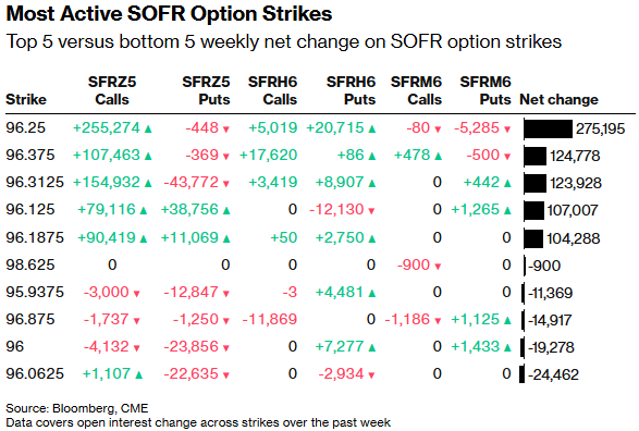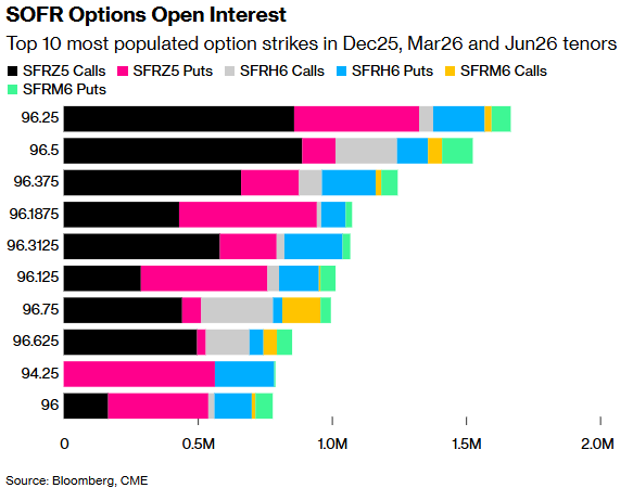 在到期日至2026年6月的所有SOFR期权中,96.25执行价仍是未平仓合约量最高的价位,原因是2025年12月期权中涉及该价位的上行看涨结构需求持续旺盛。此外,2025年12月96.50和96.375执行价的看涨期权也存在大量未平仓合约;看跌期权方面,2025年12月96.25和96.1875执行价的未平仓合约量显著偏高。