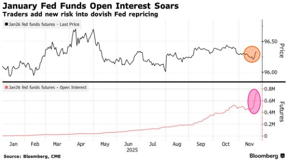 自上周四以来,1月联邦基金期货新增头寸总量接近27.5万份合约。这相当于每基点风险约1150万美元,占截至周二收盘该期限合约总未平仓合约的37%。该合约价格从上周四的96.18低点上涨至周一的96.35高点,显示新增多头头寸持续流入。
