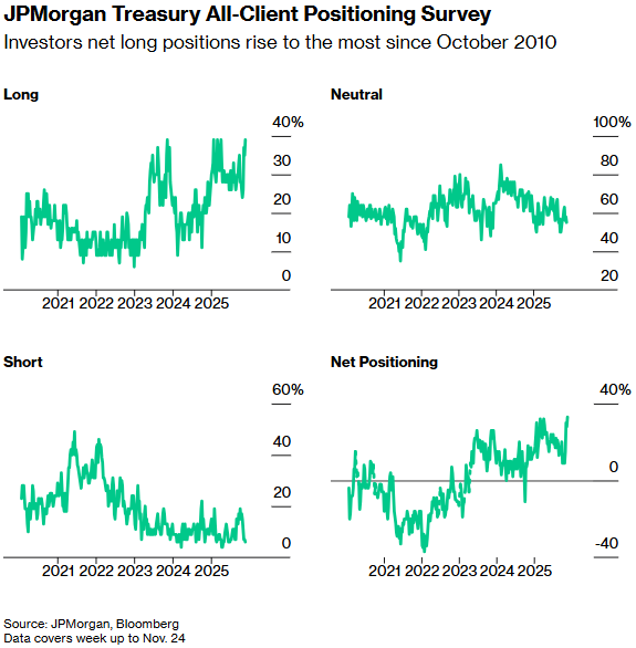 期货市场的鸽派情绪也反映在现货国债市场。摩根大通本周的客户调查显示,净多头头寸升至约15年来最高水平。