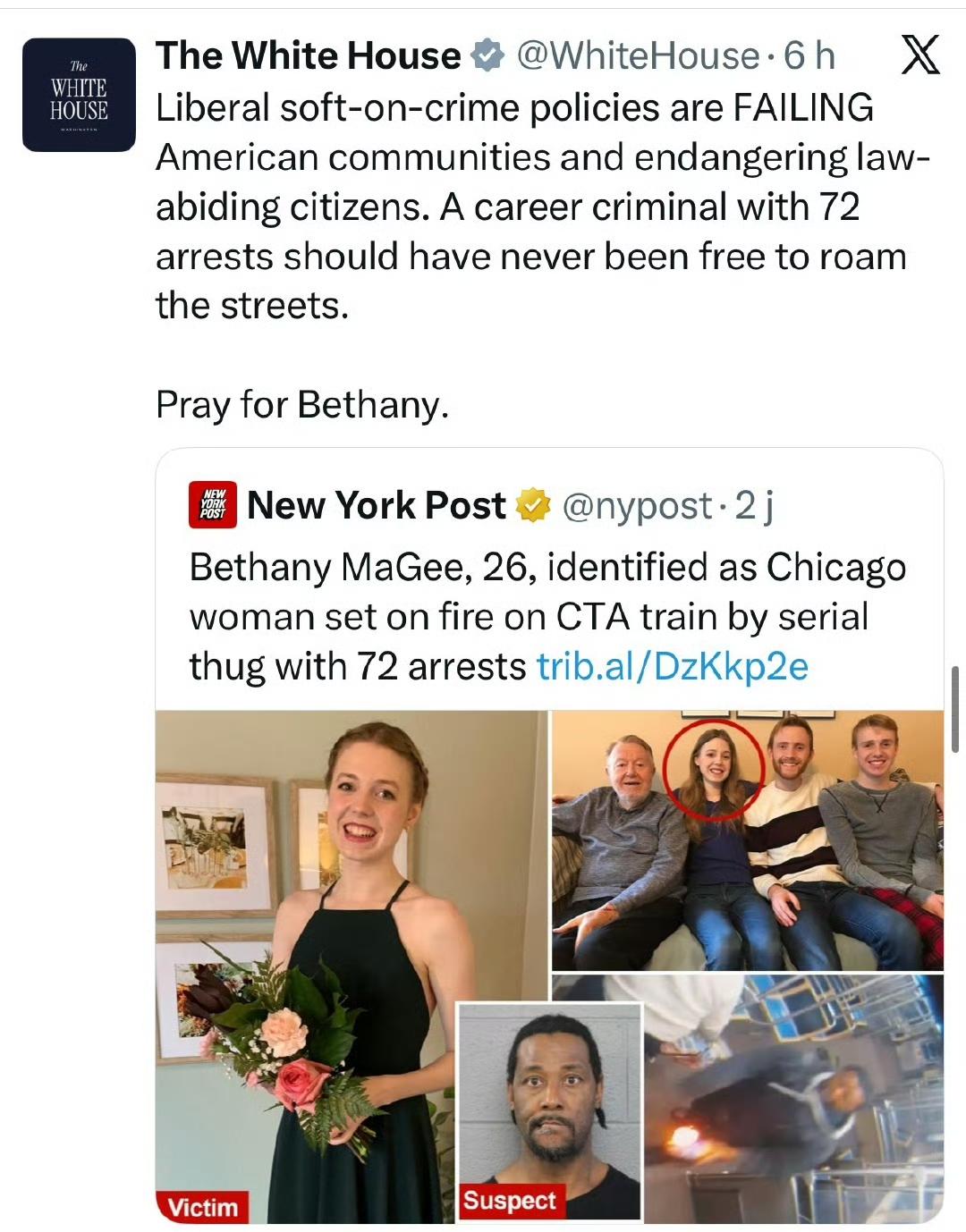 特朗普怒不可遏,一名曾被捕72次的罪犯被左翼法官释放,随后在芝加哥残忍地烧死了一名女子。 “市长无能——州长是个又肥又懒的家伙!” “他们烧死了这位乘坐火车的漂亮女子。这名男子被捕过72次……芝加哥发生的事情太可怕了。”
