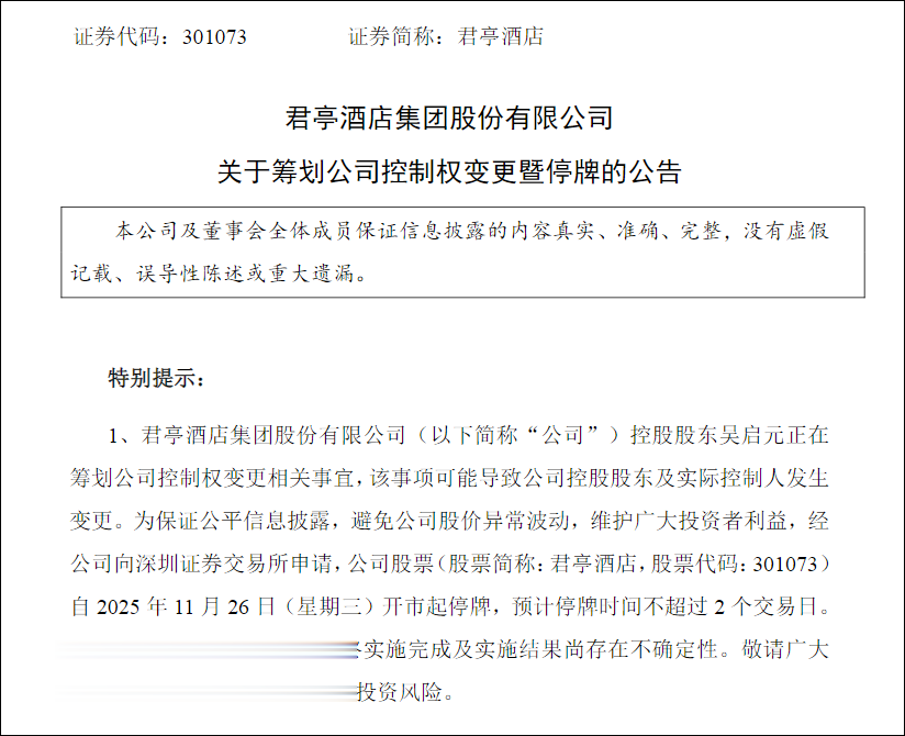 君亭酒店方面强调,本次控制权变更能否最终实施完成及实施结果尚存在不确定性,请广大投资者关注后续公告,并注意投资风险。为避免公司股价异常波动,维护广大投资者利益,公司股票自11月26日(星期三)开市起停牌,预计停牌时间不超过2个交易日。