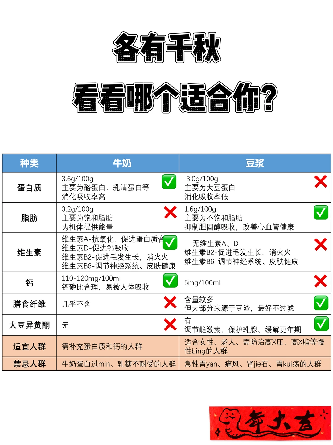 大家有没有和我一样,想知道早餐到底是喝牛奶还是喝豆浆好的🙋♀️ ☕️牛奶和豆浆其实各有营养,豆浆侠在此总结了一张表给大家讲明白,大家可以根据自身身体状况和生活习惯选择摄入奥‼️ ☕️当然,两者轮换着喝,营养更均衡哦!💪 ☕️宝子们是豆浆党还是牛奶党呢?评论区见🙋♀️