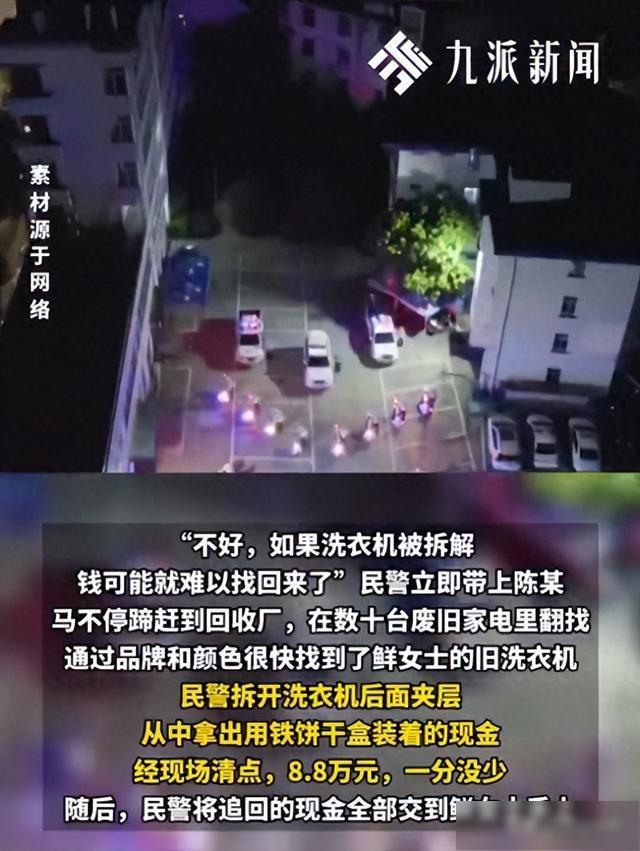 接警后,民警一边安抚心急如焚的鲜女士,一边迅速展开调查。当天17时许,经过不懈努力,民警找到了收购旧洗衣机的小贩陈某。陈某表示,上月底确实到鲜女士家中回收了一台洗衣机,但不巧的是,他已将旧家电统一运到安溪县的一处旧家电回收处理厂了。民警立即带上陈某马不停蹄赶到回收厂,在数十台废旧家电里翻找,通过品牌和颜色很快找到了鲜女士的旧洗衣机。民警拆开洗衣机后面夹层,从中拿出用铁饼干盒装着的现金,经现场清点,8.8万元,一分没少。随后,民警将追回的现金全部交到鲜女士手上。