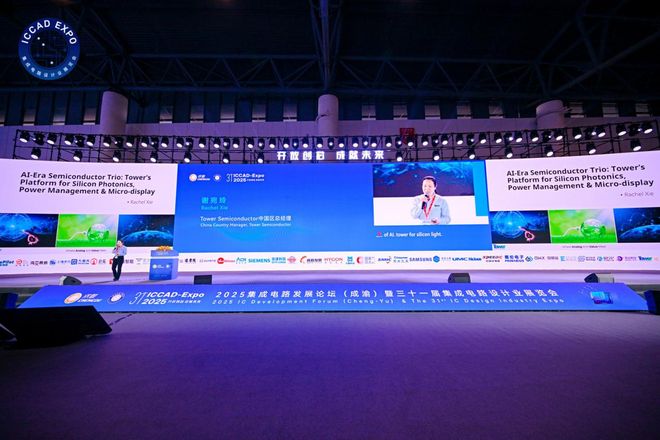 11月20日,以“成渝同芯,同屏共振”为主题的成渝集成电路2025年度发展论坛暨第三十一届集成电路设计业展览会(ICCAD-Expo2025)在成都西博城隆重开幕,TowerSemiconductor中国区总经理谢宛玲在高峰论坛上发表了以《AI时代的半导体工艺三重奏:Tower面向智能计算的硅光、微显示和电源管理》为主题的演讲,阐述了在AI时代来临的背景下,Tower在硅光、微显示和电源管理领域的布局。