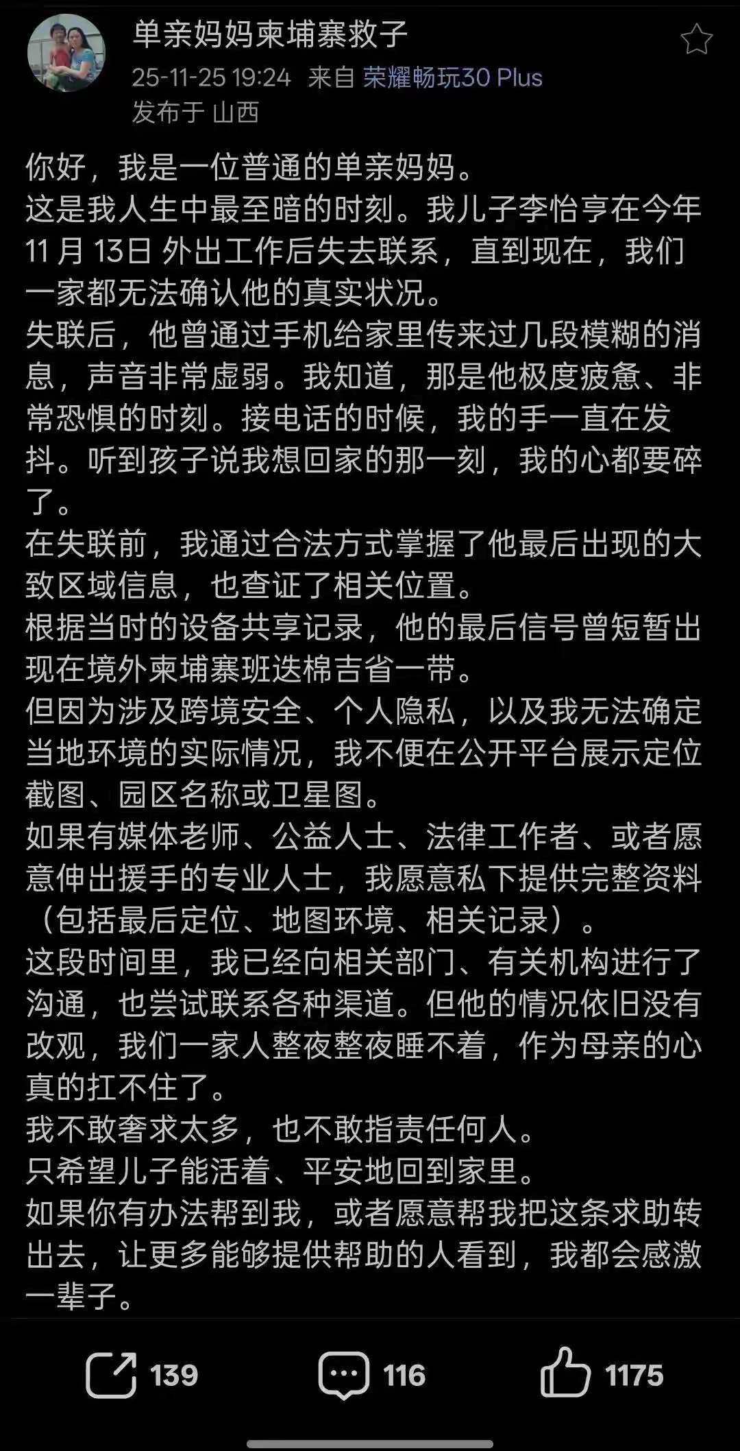 家属回应仝卓表弟柬埔寨失联13天演员仝卓的表弟李怡亨这事儿也太让人揪心了!30岁的小伙子本来在上海干安保,11月8号说要去南宁做展会临时工,9号到了南宁,13号中午手机直接关机找不到人了!家人一查可吓坏了,他手机最后定位居然在柬埔寨,那附近全是电诈园区啊!15号还接到个境外电话,李怡亨声音虚弱得不行,明显有人在旁边盯着,一个劲让家人打钱,之后就彻底没信儿了。现在家里已经报警立案,中国驻柬使馆也在帮着联系当地警方,仝卓也发社交平台求助,希望大家多转发帮忙找人!仝卓表弟手机最后定位附近有园区仝卓表弟曾来电旁边有人提要钱说真的,现在反诈宣传做得这么到位,不少电诈园区也被端了,本来以为情况能好很多,结果这些坏人还在钻空子!用“国内临时高薪工”当幌子,把人骗到边境就偷偷弄去国外控制,逼着家人掏钱,也太缺德了!这事儿也让咱们明白,反诈真的任重道远,平时遇到不认识的人招短期工,尤其是说“轻松赚钱”的,可得多留100个心眼,查清楚底细再答应!希望李怡亨能早点被救回来,也盼着警方能狠狠打击这些电诈黑产,别再有人上当了!