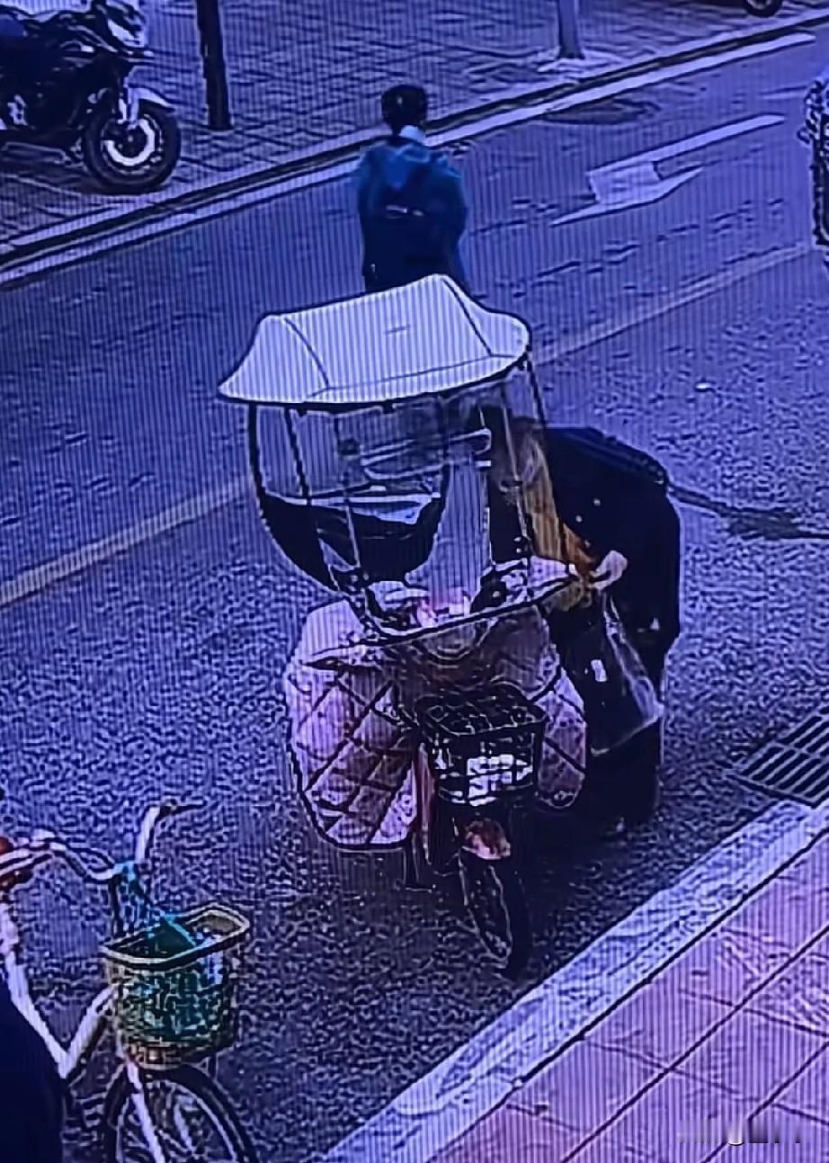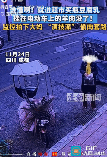 活不起了?近日四川成都,一女子买了羊肉放在电瓶车上,去超市买豆腐乳的期间,竟然被偷了,女子直接把视频给曝光,网友: 见怪不怪了,一看就是惯犯了,手法娴熟。 女子买了羊肉回去,路过超市门口时,就把肉挂在了车上,人进去买了一瓶豆腐乳回来后,车上的肉不见了。 在查看监控后发现,是一位大妈给顺手牵羊了,从曝光的监控中看到,先是做了一套假动作,又是整理鞋带的,又是整理包的,又是左看右看行人的,最后一举两得,得手后就开溜了。 她是不是忘记了,现在满大街或者是店铺门口都有天眼呀,这下真的丢人丢到家了,不仅家人跟着丢人,就连亲戚朋友可能都会在背后戳她吧。 千万别做这偷鸡摸狗的事,一不小心发网上了,只要是认识的人,亲戚,朋友,下 辈一看都能认出来,丢不起那人,吃那点肉,比吃屎都难受[捂脸][捂脸]
