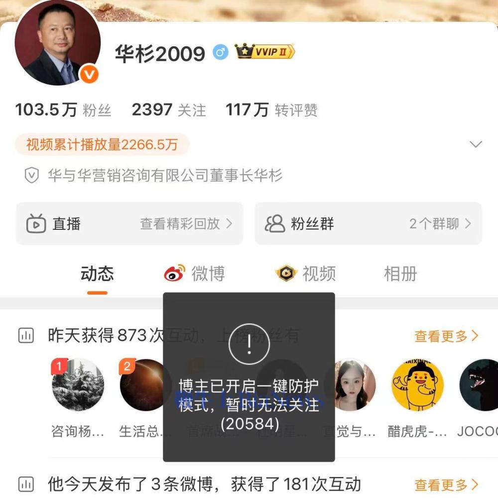 11月26日,鞭牛士搜索发现,目前与罗永浩“热战”的华与华创始人华杉默默地将账号打开了“一键防护”功能,设置了禁止关注。