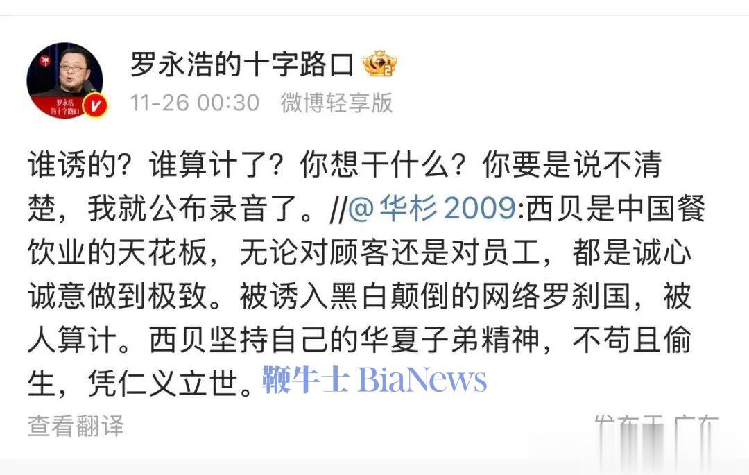 此前,华杉在微博再次点评西贝事件,称西贝被人算计,暗示罗永浩是罗刹国,引发罗永浩回怼。