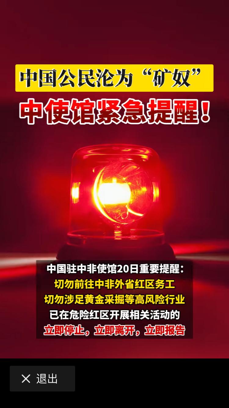 非洲犯罪集团最近对华人下手了,层出不穷的犯罪手法,让国人被绑架,被车祸死于非命。 以挖矿捞金的幌子,让国人前往非洲。情况已到了非常紧急的状态,大使馆紧急发出了通知,立刻停止,立刻离开,还有立即报告。大使馆将提供相关帮助。 不要沦为矿奴,结果要比东南亚诈骗集团更惨烈。 出门在外的华人沦为行走的财富,保护好自己!