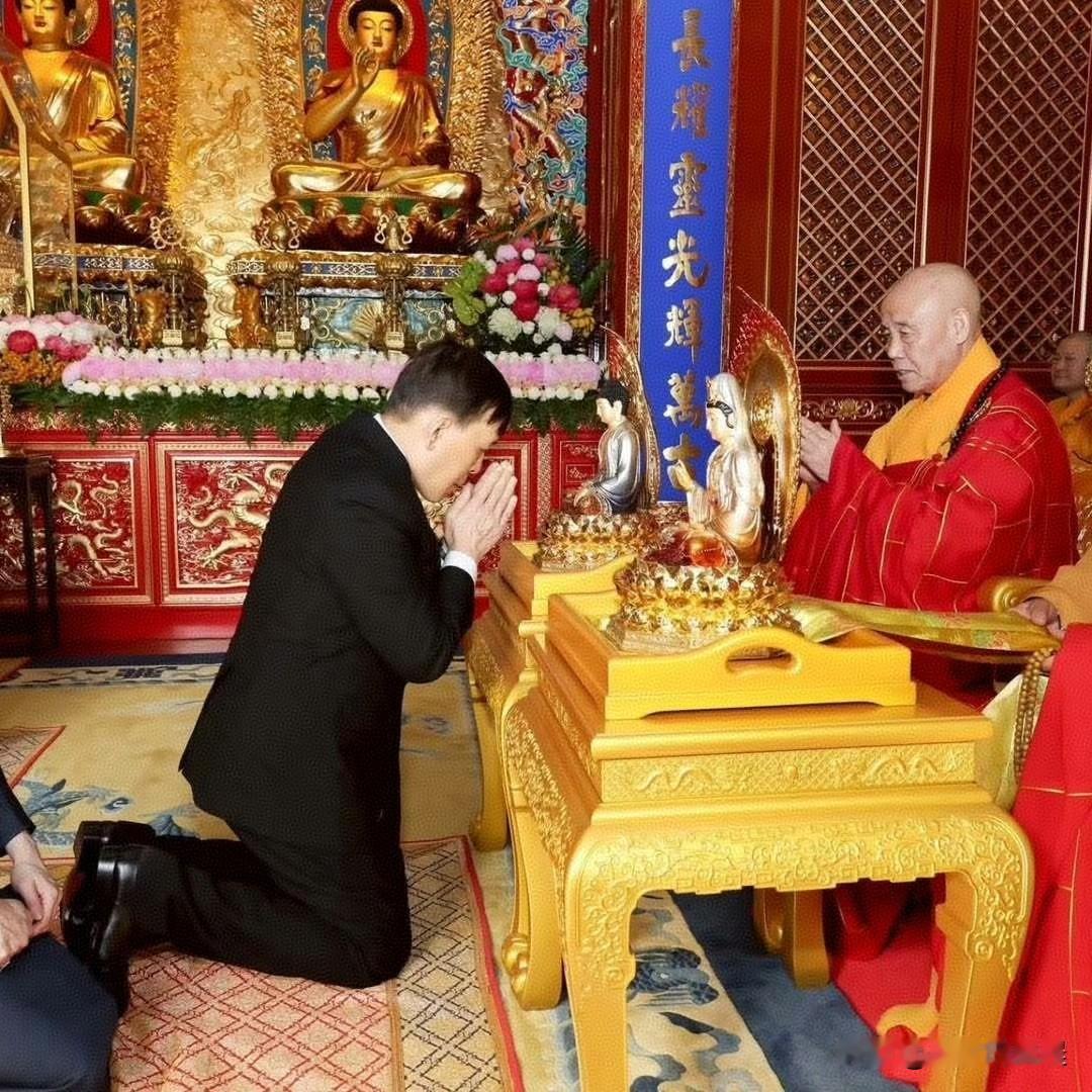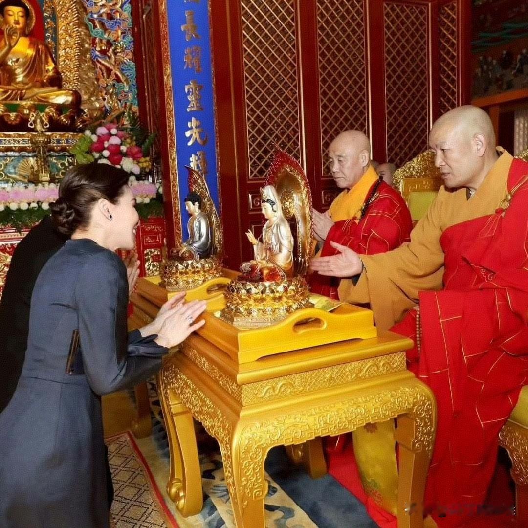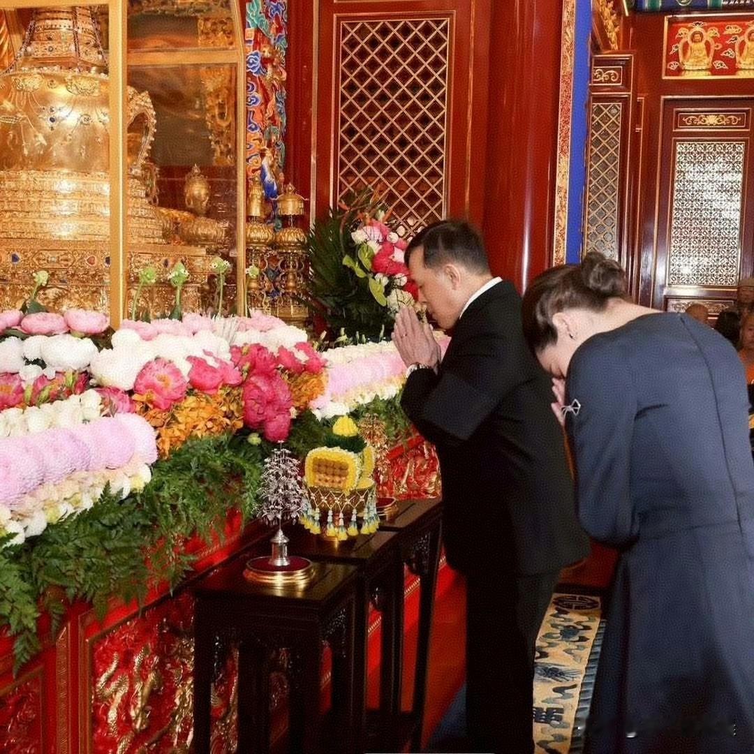 泰王与王后参观了北京西山八大处的灵光寺,夫妇二人向舍利像与释迦牟尼佛、弥勒佛三尊圣像敬奉供品,并再次行跪拜礼,这是第一次见泰王在国外下跪啊
