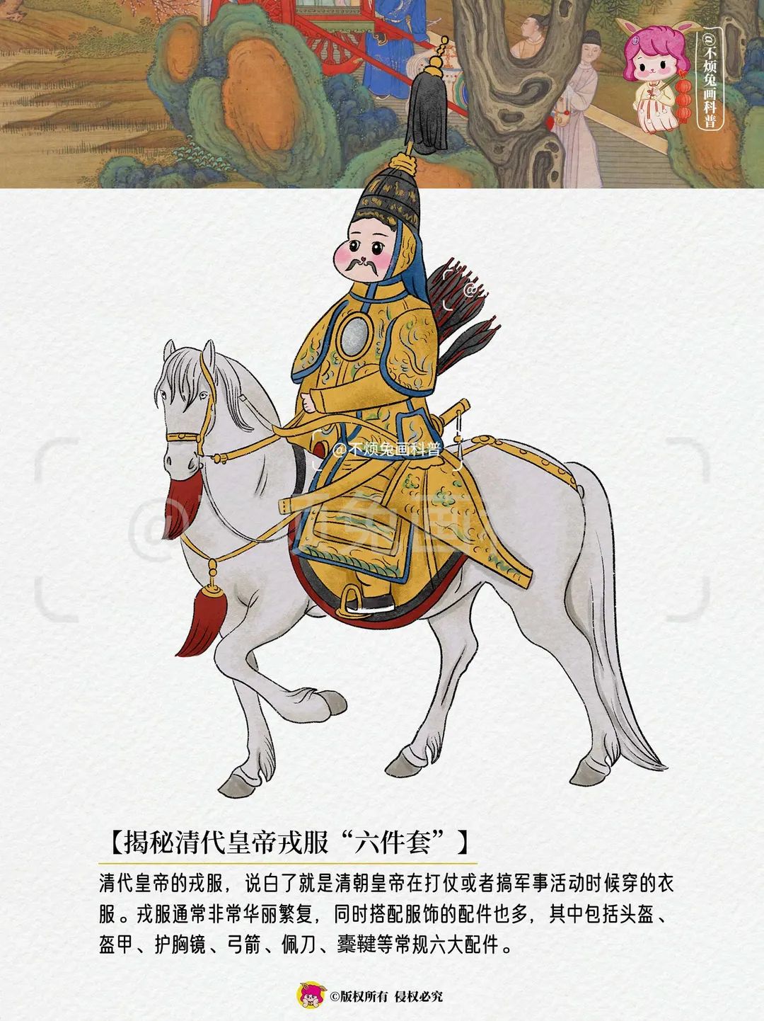 🔶清代皇帝的戎服,说白了就是清朝皇帝在打仗或者搞军事活动时候穿的衣服。这衣服可不简单,它代表着皇帝的权威和地位。首先它得结实耐用,还得方便活动,还得庄严大方,所以通常这衣服的颜色会选用明黄色,因为黄色在古代是皇家专用的颜色,代表着尊贵。衣服上还会绣上龙纹,代表着皇帝至高无上的权力。 - 🔶戎服通常非常华丽繁复,同时搭配服饰的配件也多,其中包括头盔、盔甲、护胸镜、弓箭、佩刀、櫜鞬等常规六大配件。 -