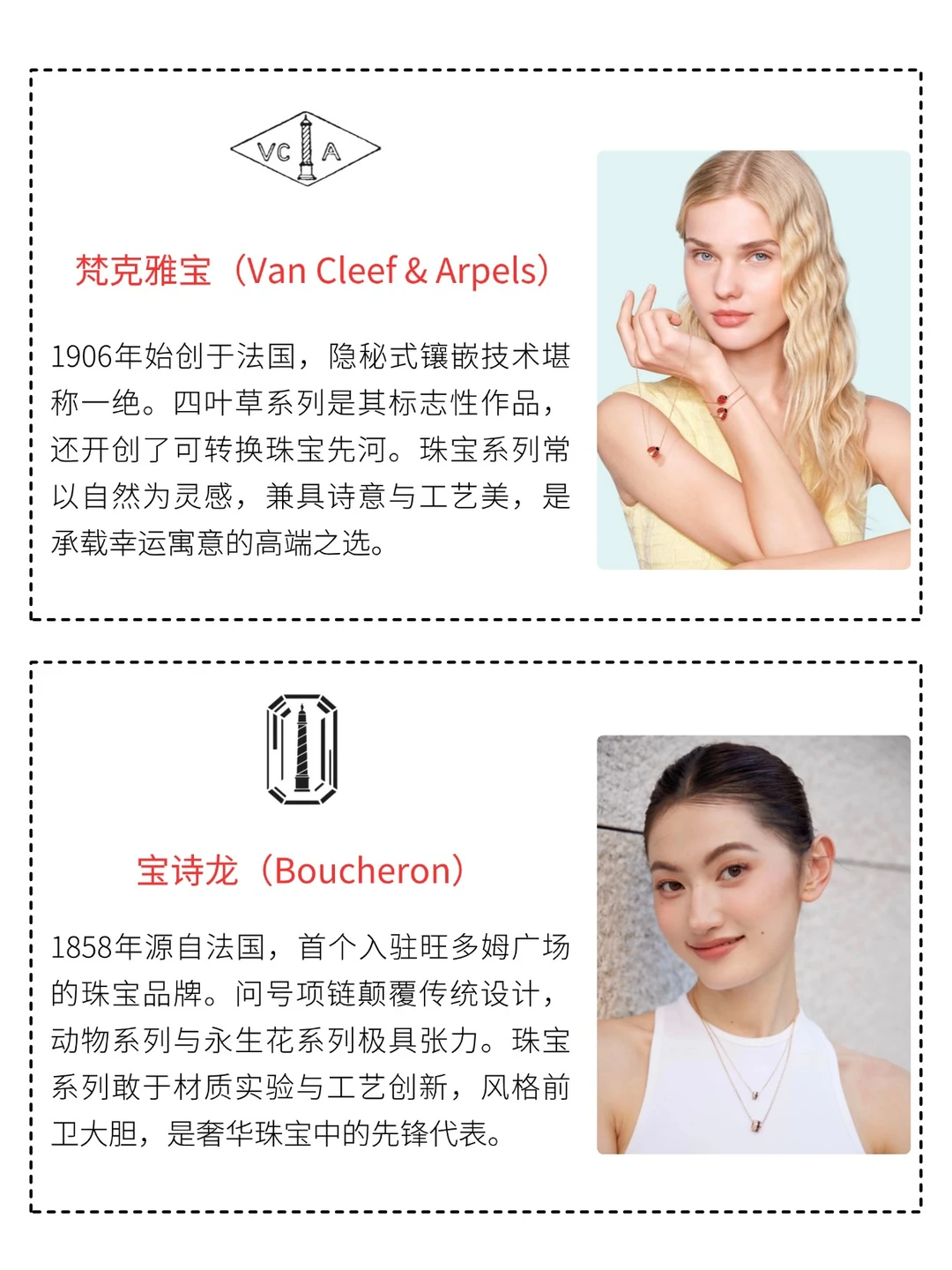 1906年起家的“珠宝诗人”,独创“隐秘式镶嵌”令宝石无缝衔接。四叶草系列经典隽永,寓意幸运,部分作品支持多场景转换,工艺与情感并重。