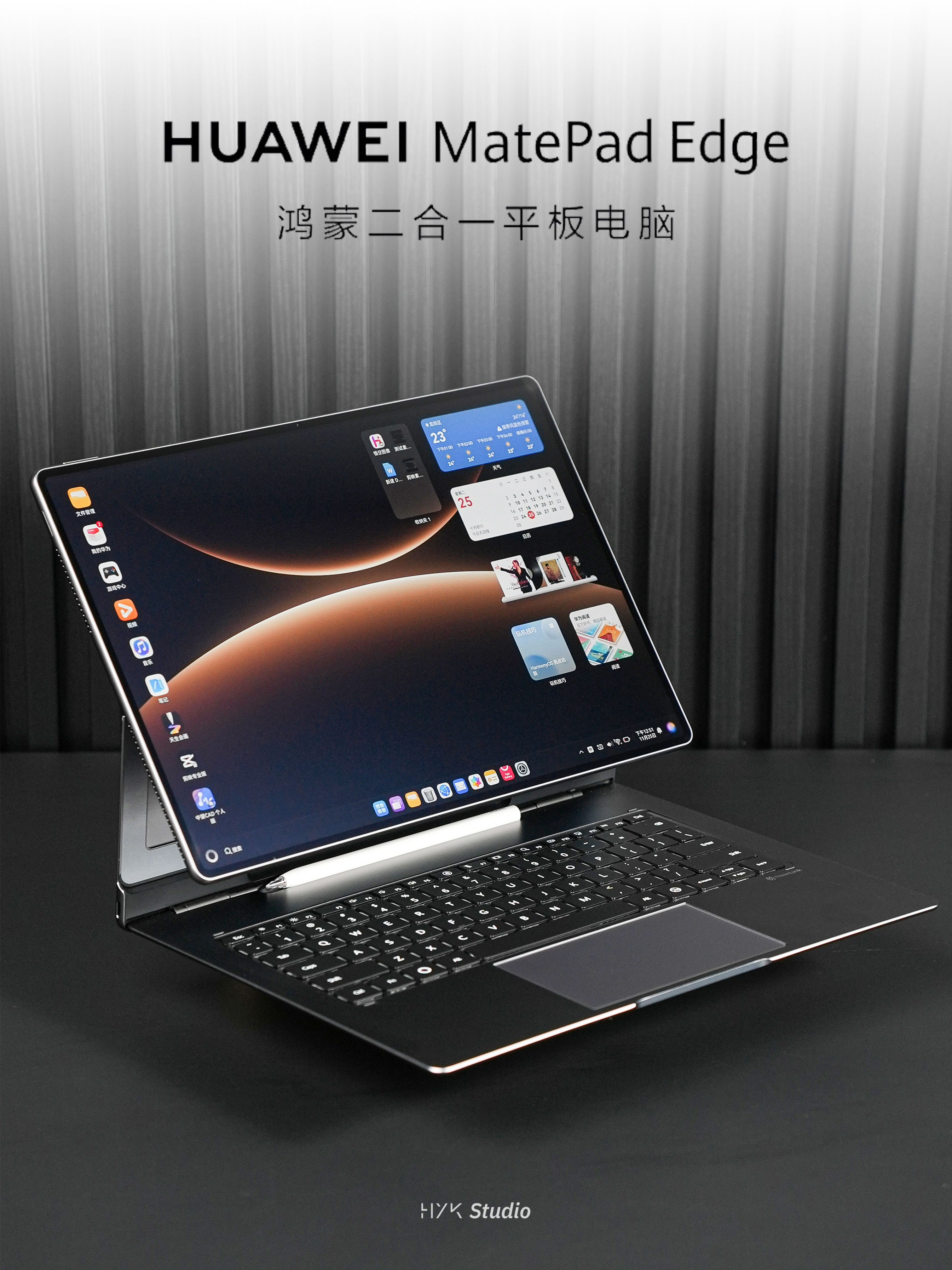 HYK图赏|华为MatePad Edge接上配套的悬浮键盘就是电脑,取下来就是一块搭载14.2英寸3.1K OLED云晰柔光屏的平板,有趣的同时视觉体验也没有落下,并且这块屏幕本身的厚度只有6.85mm,带出门也是没有压力的。键盘上有专门的手写笔收纳槽,屏幕边框也有专门做手写笔的磁吸,售价5999元起。大家冲吗?首款鸿蒙二合一平板电脑正式发布