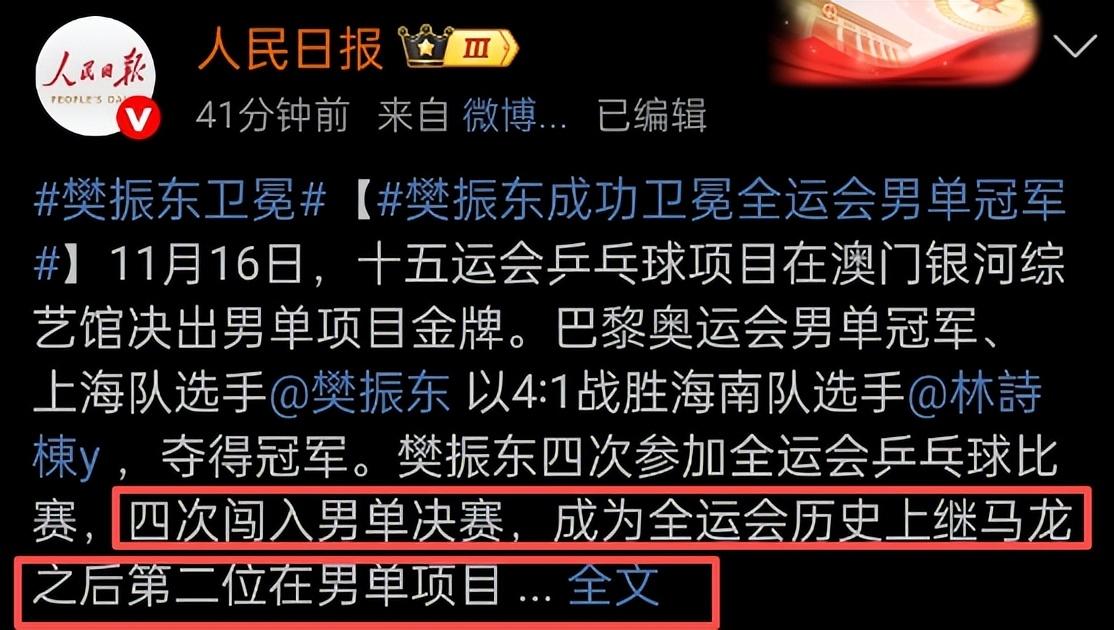 十战十胜,两胜王楚钦!马龙说对了,外媒:樊振东不需要世界排名! 当樊振东在男单决赛最后一记反手拧拉得分,整个体育馆沸腾了。这位28岁的乒坛名将,以全运会十战全胜的完美战绩,成为继马龙之后第二位成功卫冕男单冠军的选手。 他在赛事中两次正面击败世界排名第一的王楚钦,用实力回应了所有质疑。 麻烦各位读者点一下右上角的“关注”,留下您的精彩评论与大家一同探讨,感谢您的强烈支持! “樊振东不需要世界排名来证明自己。”这句在外媒圈流传的评价,如今看来恰如其分。从男单赛场到团体对决,他展现出了令人叹服的技术稳定性。 与王楚钦的两次交锋堪称经典,首战在僵持四局后连下两城取胜,再战则在先失一局的情况下连扳三局逆转。赛后王楚钦用头轻触球台的画面,恰是这场激烈较量最真实的注脚。 这位赛场上的王者,却常年饱受“饭圈文化”困扰。当年只因在休息时间看了场泰勒·斯威夫特的演唱会,就被贴上“崇洋媚外”的标签;私人信息遭泄露,家人被骚扰,甚至有人闯入酒店房间;选择赴德参加联赛本是为提升技艺,却被某导演扣上“卖国求财”的帽子。 面对这些,樊振东始终以沉默回应,把全部精力倾注在训练场上。 如今的全运会佳绩,让张继科早年“小胖必成大满贯”的预言正在成真,也让马龙“樊振东是国乒领军人物”的评价得到印证。 更难得的是他的格局:上海队团体赛失利后,他依然面带微笑拥抱对手,许昕调侃“52年运气用完”时他开怀大笑。这种“胜不骄败不馁”的气度,恰是当代运动员最珍贵的品质。 樊振东在德国联赛的历练显然助他完成了蜕变。四个月海外征战,他不仅带领俱乐部创下门票售罄纪录,更荣获“十大杰出华人青年奖”。 如今他的技术体系更加丰富,相持能力愈发稳健,关键分处理更显老辣。这些进步在全运会上展现得淋漓尽致,就连年轻气盛的林诗栋在他面前也显得束手无策。 国乒正处在传承的关键节点。当王楚钦临近退役,林诗栋等新秀尚未完全成熟之际,樊振东的稳定发挥成为国乒最可靠的保障。 他的存在,不仅维系着队伍的竞争力,更以其专业态度抵制着体坛的“饭圈化”歪风。正如网友所言:“看樊振东打球,才知道什么是纯粹体育精神。” 您如何看待樊振东用全运会十连胜回应外界质疑?在竞技体育中,运动员应该如何面对“饭圈文化”的干扰? 欢迎在评论区分享您的见解!