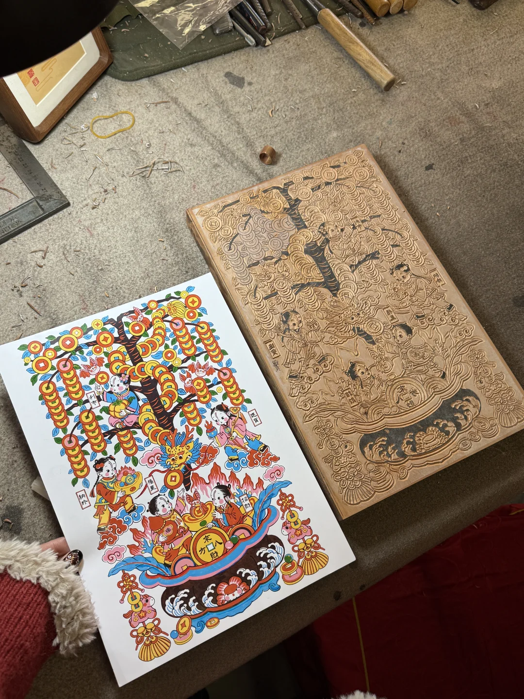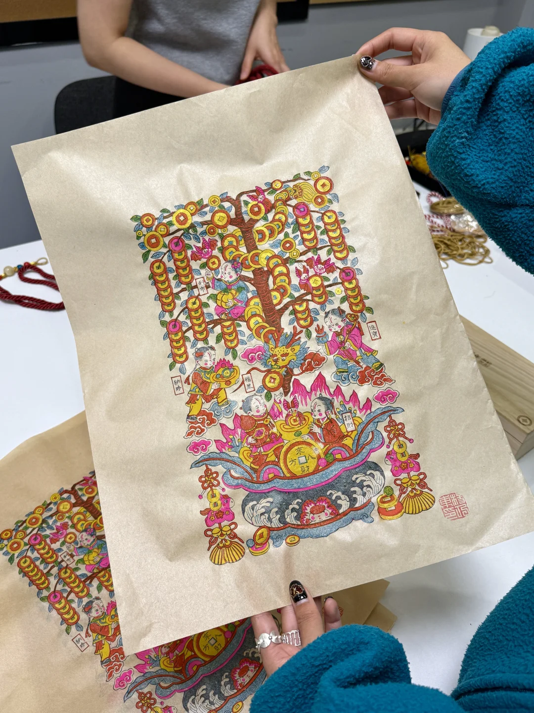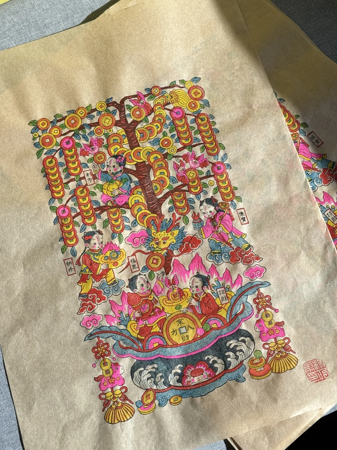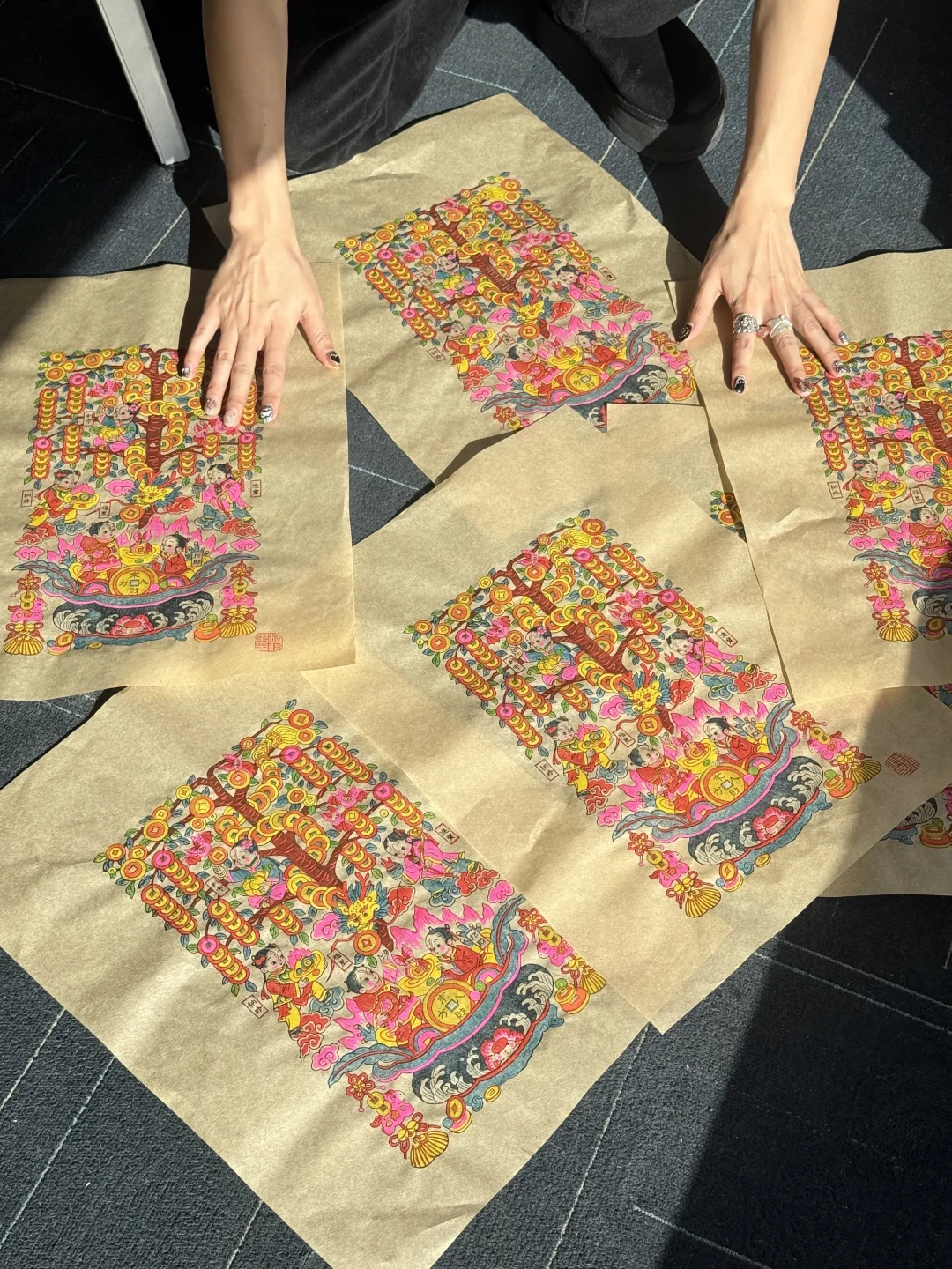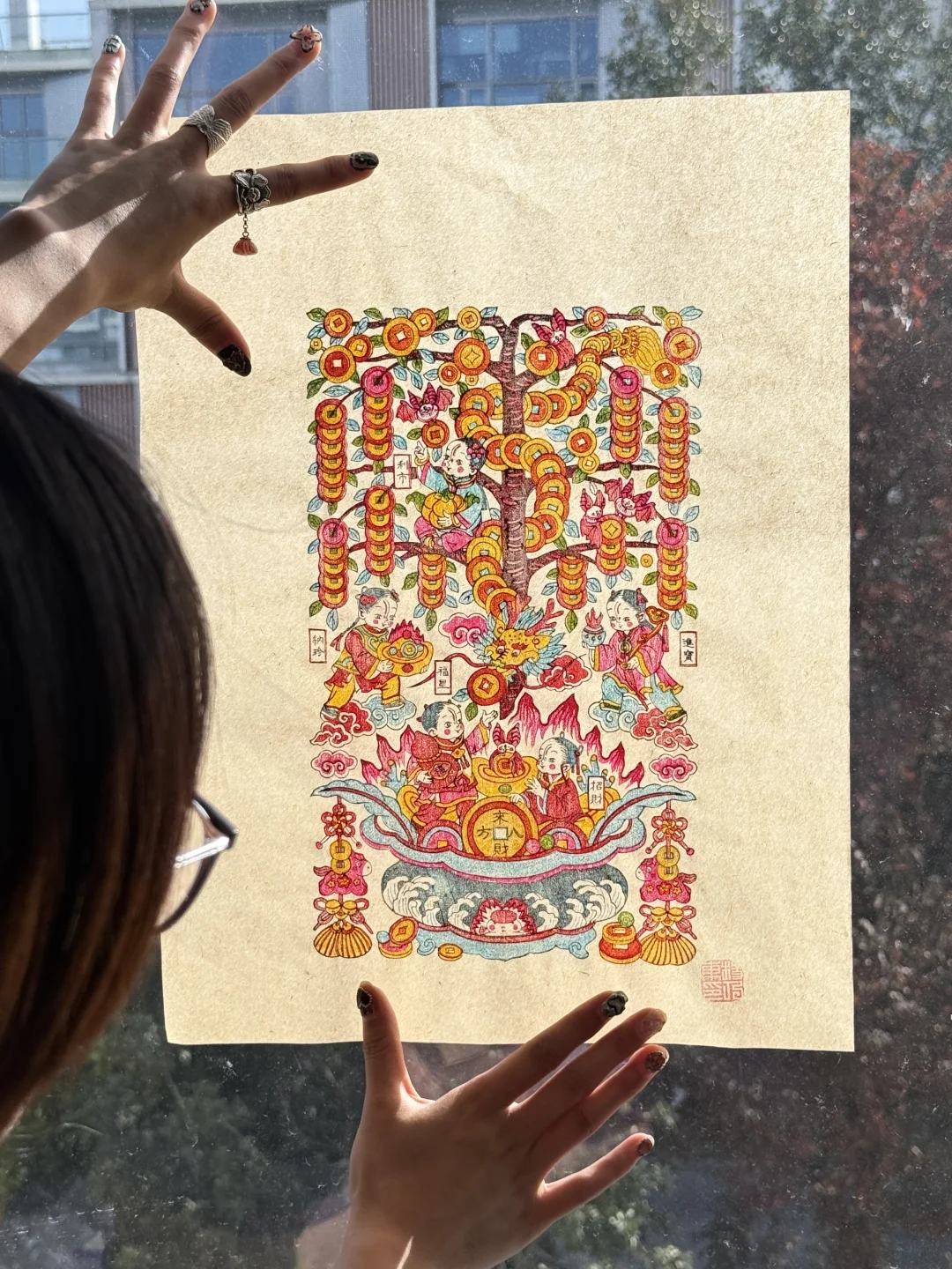 在传统套色基础上加入“印金”、让年画在灯光下真的会“亮起来”,既保留传统韵味,也更适合现代家居;