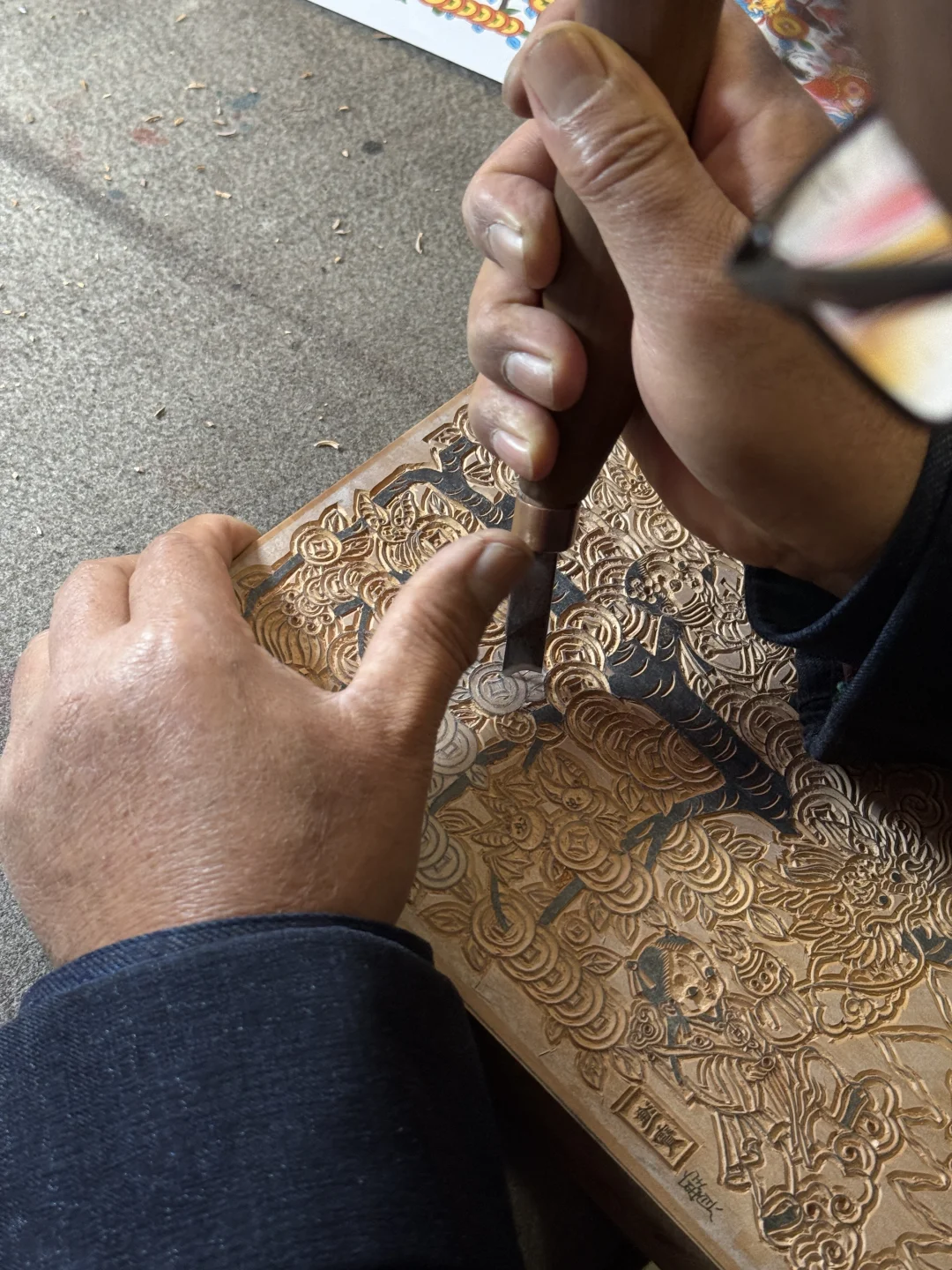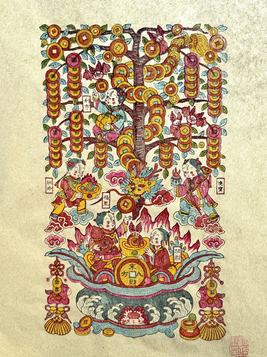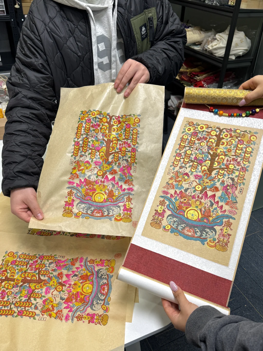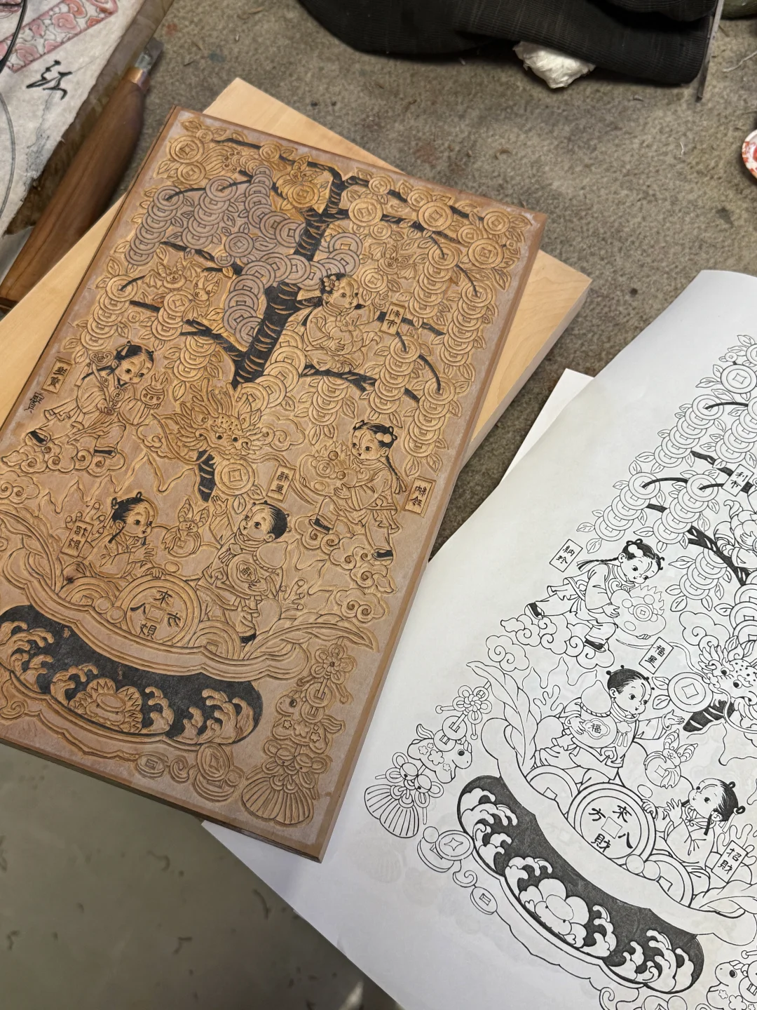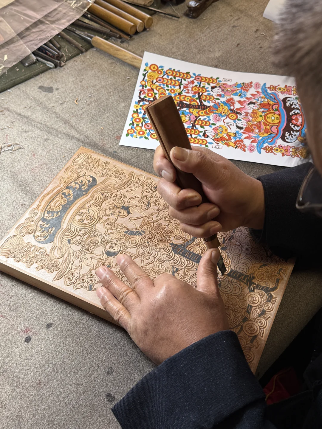 在传统套色基础上加入“印金”、让年画在灯光下真的会“亮起来”,既保留传统韵味,也更适合现代家居;