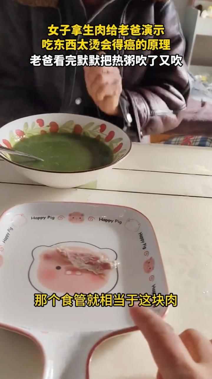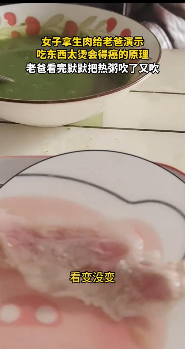 近日河北石家庄,一女子劝家里72岁的父亲不要吃太烫的东西,可是父亲不理解原因,等女子做完这个动作后,父亲总算明白了! 女子见嘴上跟父亲讲,他不明白,于是到厨房拿来一块生肉,然后用很烫的热水开始烫肉,生肉很快就变样了!像要熟了一样!女子说,你吃烫的东西下去,你的食管里的肉就跟这块肉是一样的,是一个道理!父亲看完后,恍然大悟,对着碗里的粥是吹了又吹!